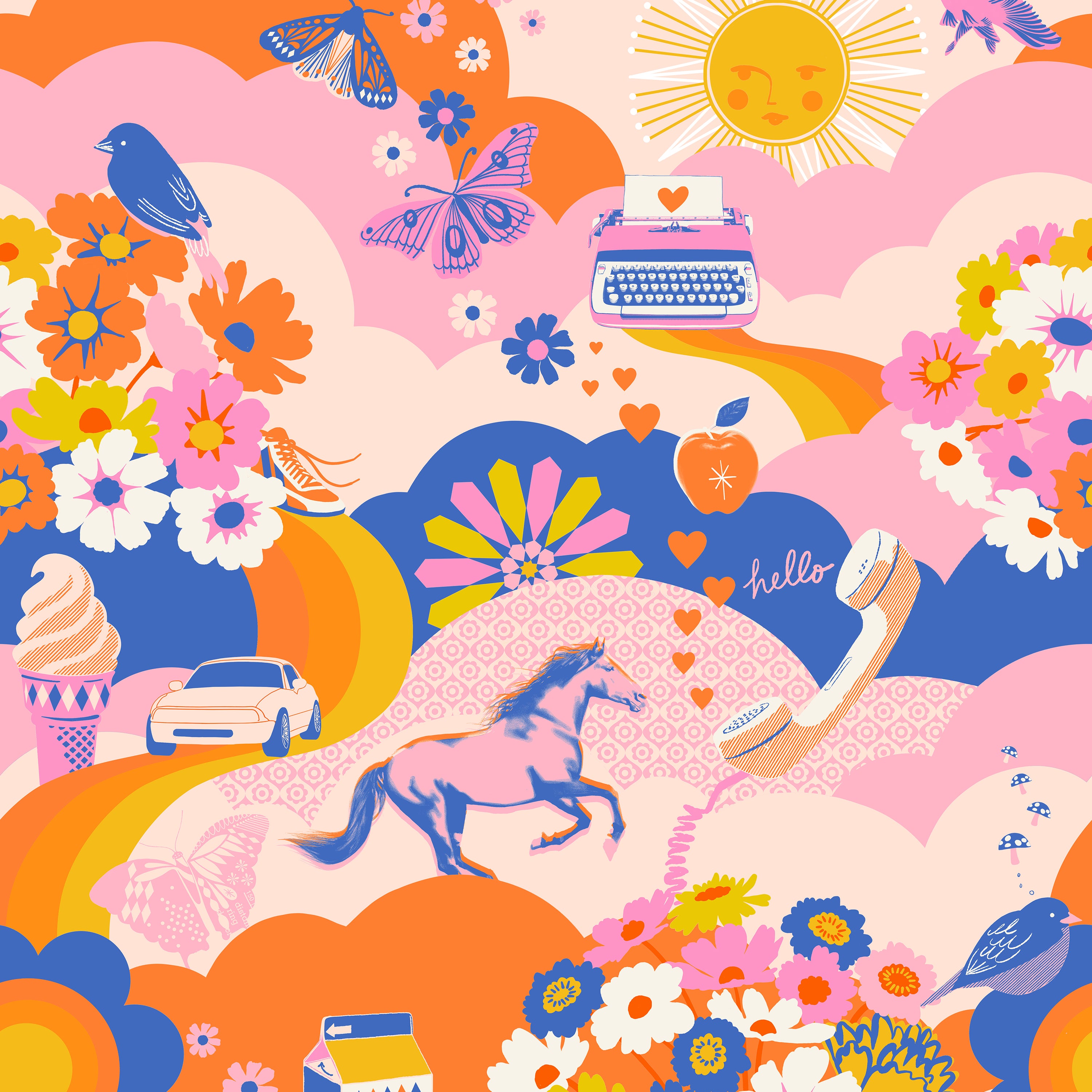 Melody shares the inspiration behind this collection: it started with a wish to revisit some of her favorite designs, including ice cream cones and typewriters. The centerpiece, the large Best Day Ever print, unites many beloved motifs—from fresh floral elements to horse and typewriter sketches created over a decade ago. Nostalgic touches like the bird, ice cream cone, and telephone reference her first Ruby Star Society release. This line also revives the Typewriters print featured on fabric since 2011, now complemented by a new panel showcasing four oversized typewriters inspired by recent artwork. Additionally, the Ice Cream fabric returns in a range of new hues, accompanied by new colors of the popular Hearts print, quickly becoming a favorite accent.