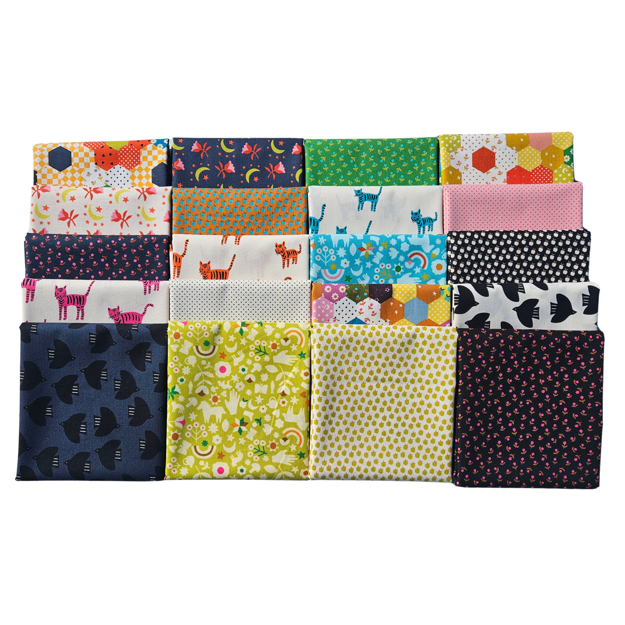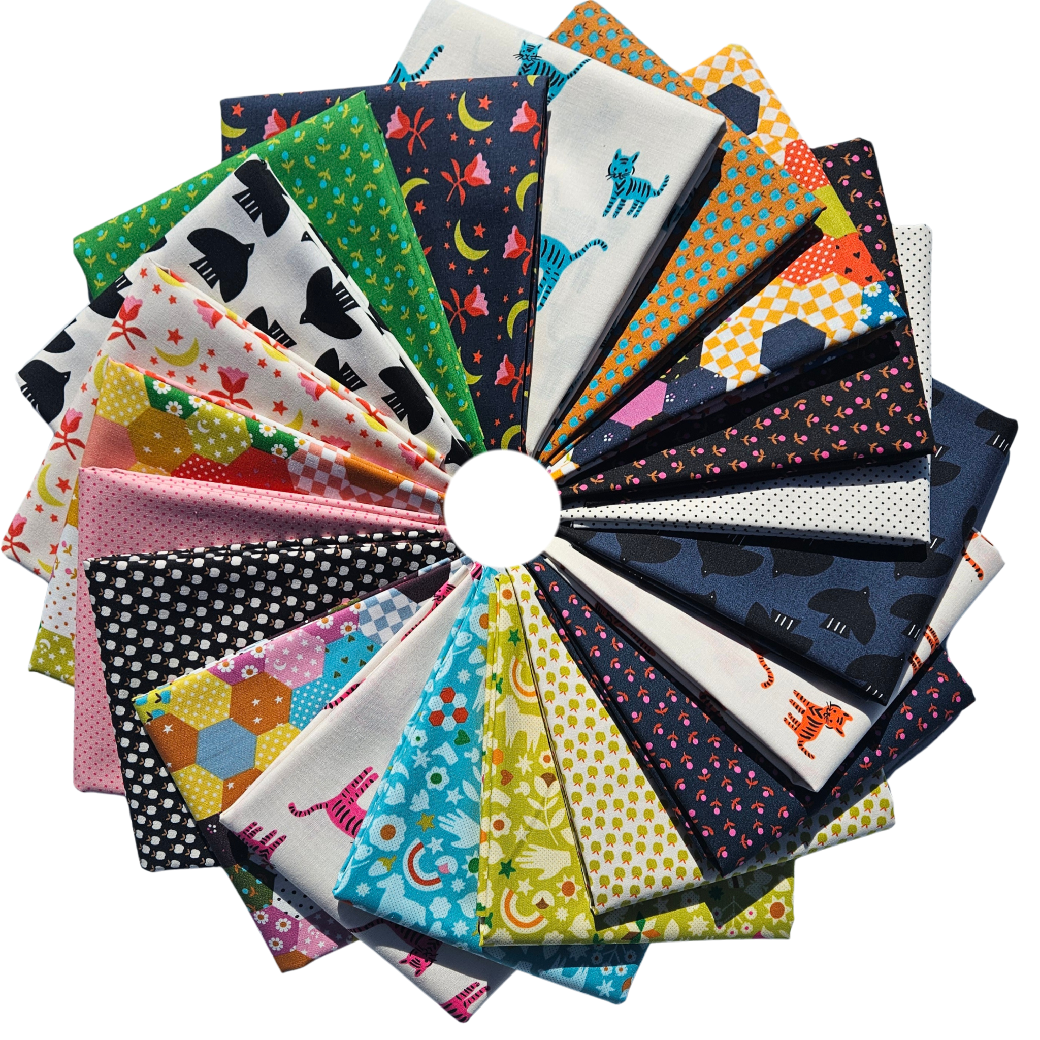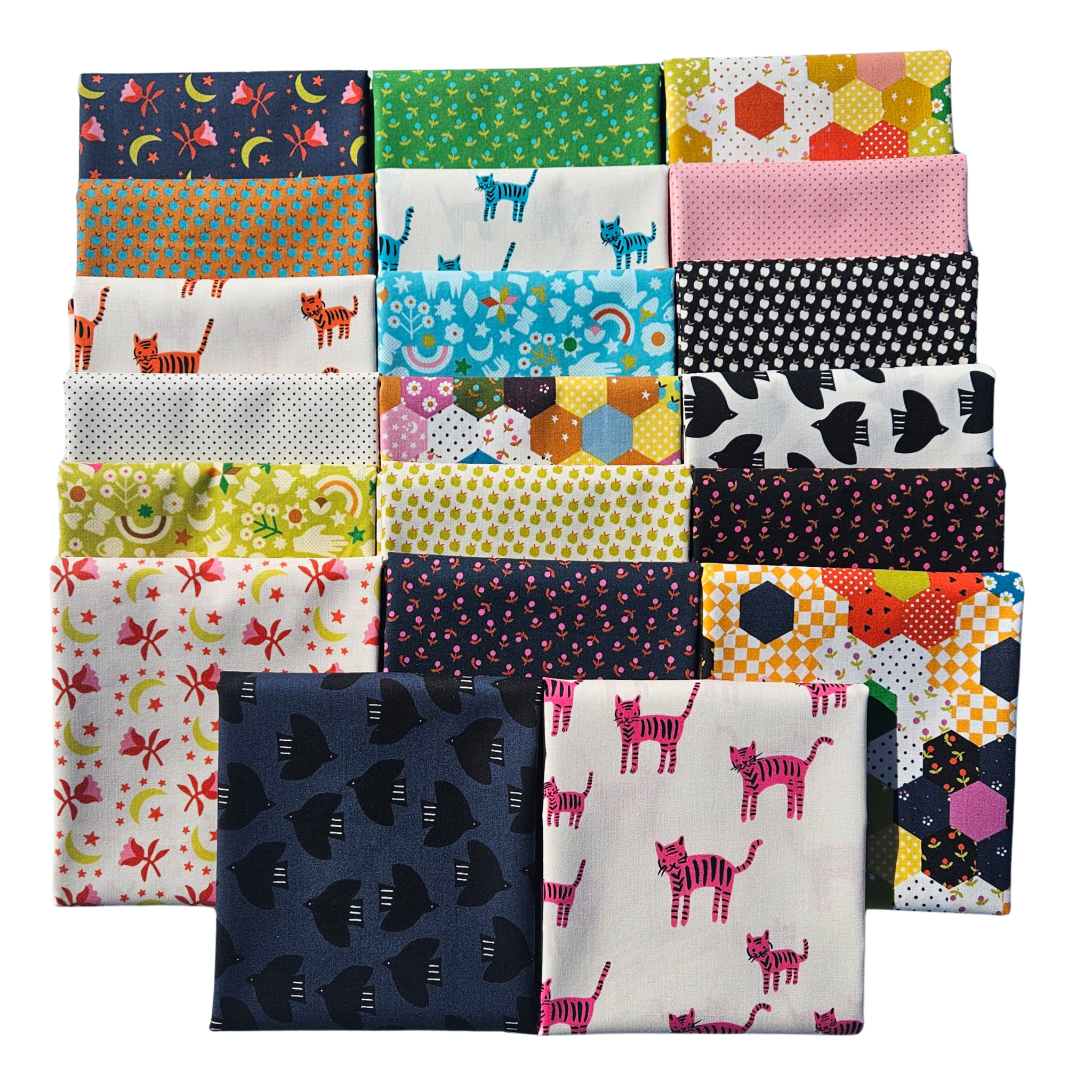 Catnap represents a triumphant return of Alexia's most beloved and successful design. Inspired by feline charm, this collection channels a playful, imaginative aesthetic across multiple fabric options. The lineup features four Tiger Stripes colorways, each honoring the original palette from its initial release. A Grandmother's Flower Garden-inspired cheater pattern anchors the collection, available in standard cotton and a dramatic large-scale wideback version. Complementing these centerpieces are the reintroduced Mini Dot and Sprout prints, joined by whimsical motifs including birds, apples, botanical elements, celestial accents, and stars. Together, these designs create a cohesive, versatile collection that balances nostalgic charm with contemporary appeal.