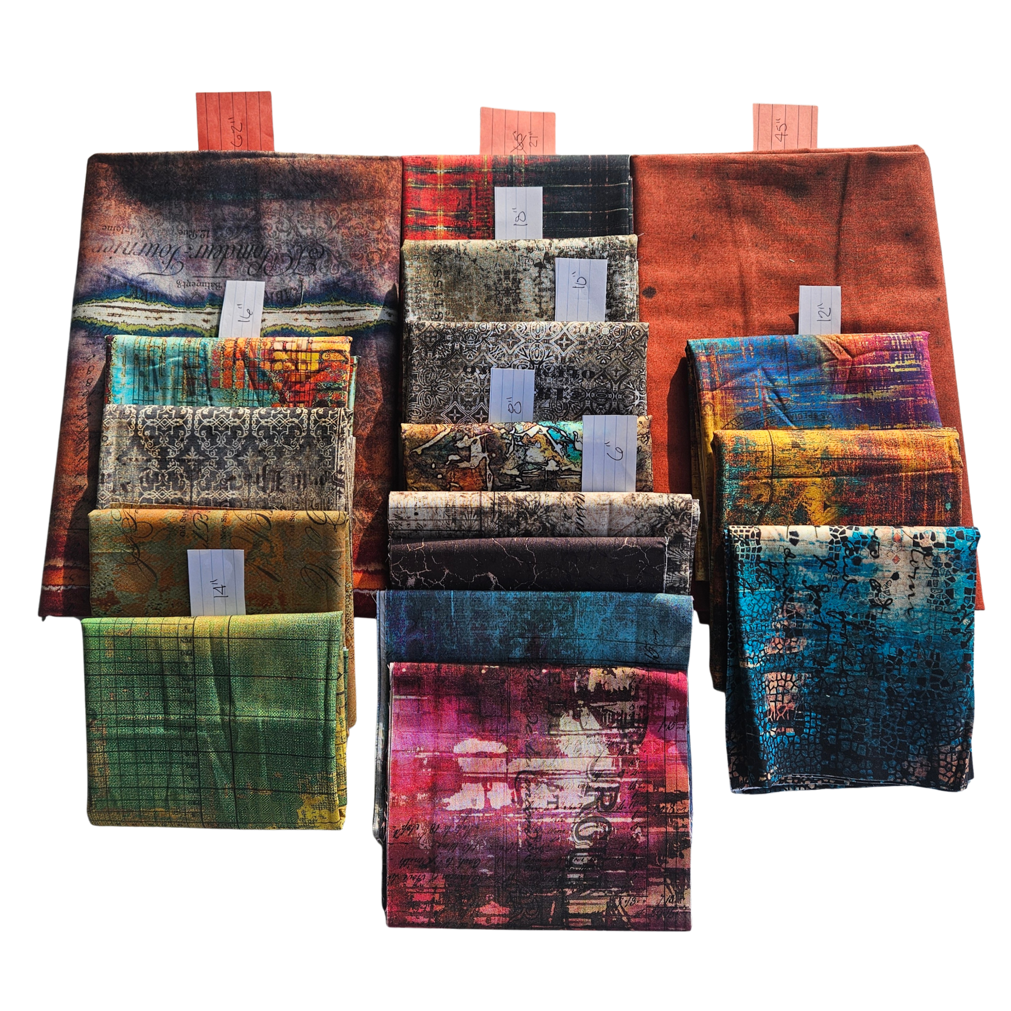 This Abandoned, Abandoned 2 and Provisions Eclectic Elements Remnant Bundle includes 17 pieces ranging in size from 6" to 62", for a total of 8 yds, 4".  All fabrics were designed by Tim Holtz for Free Spirit Fabrics.