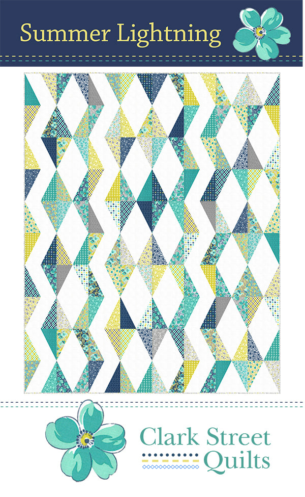 The Summer Lightning Quilt pattern is a Layer Cake quilt designed by Linzee Kull McCray of Clark Street Quilts. Finished size: 64.5" x 80.5".