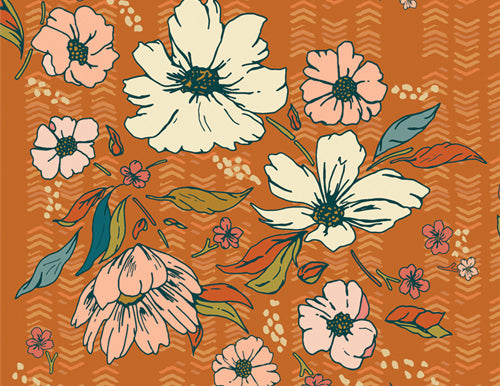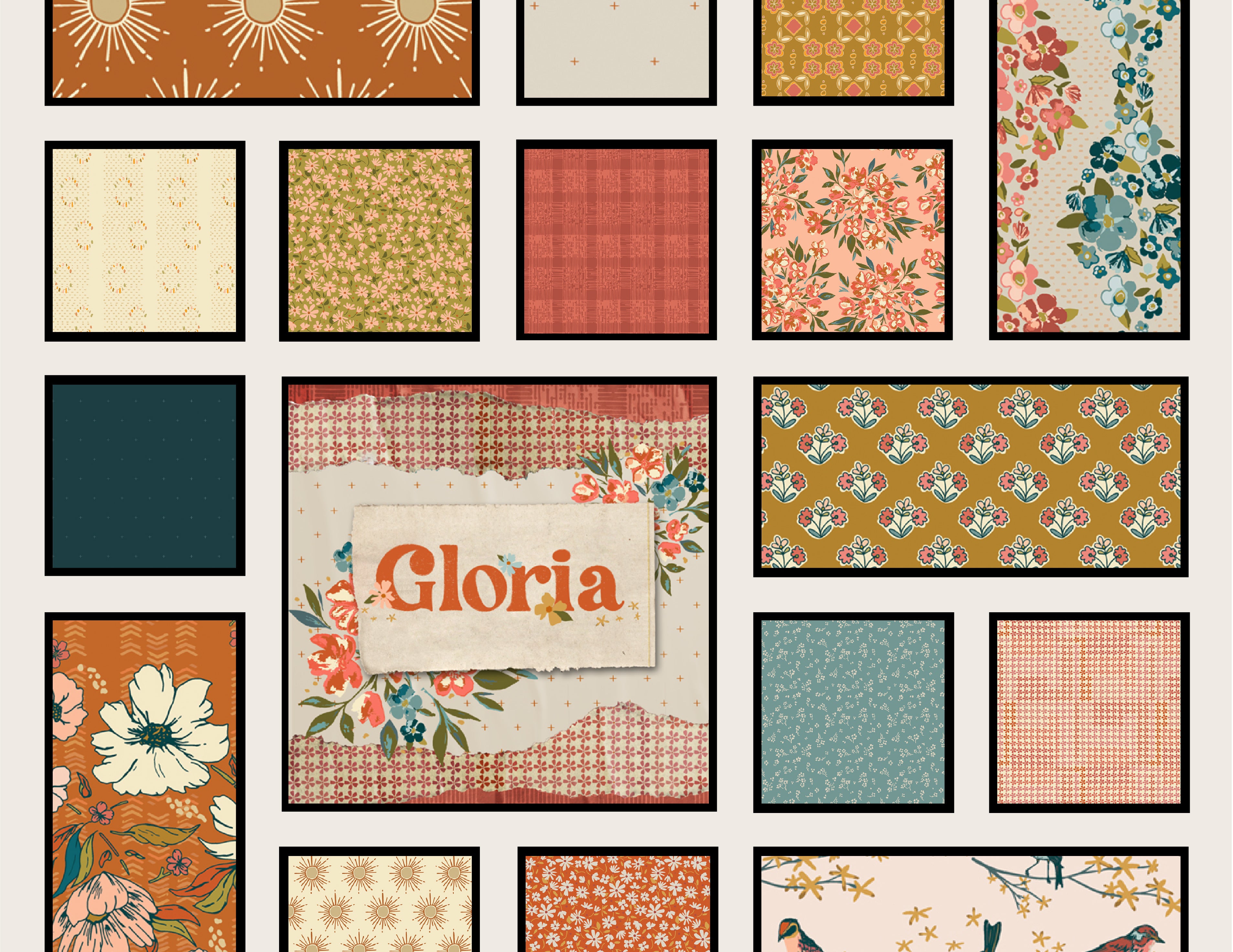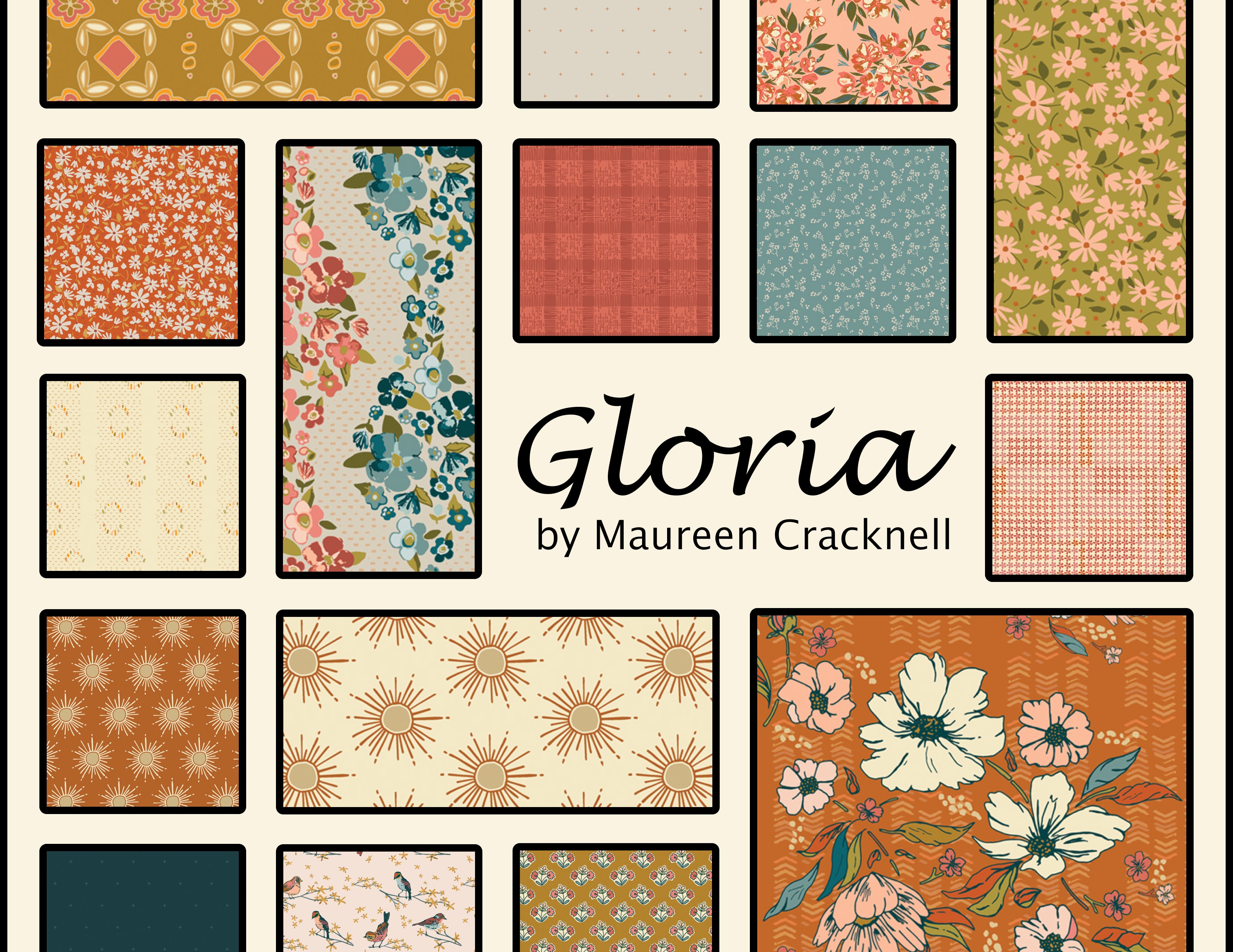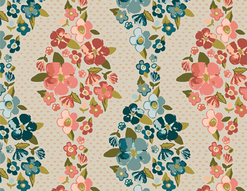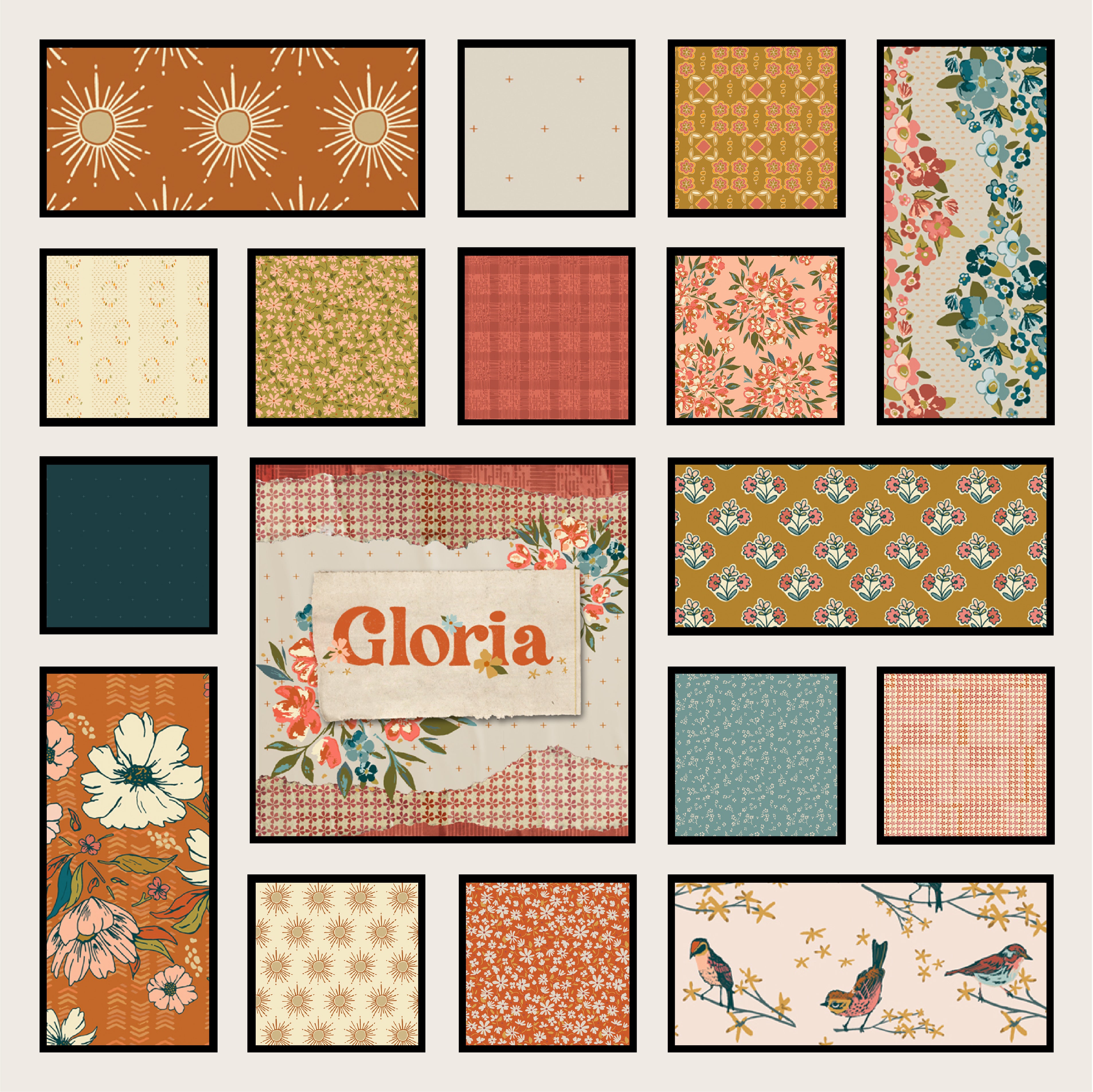 Gloria by Maureen Cracknell for Art Gallery Fabrics. Gloria is a collection inspired by Maureen’s grandmother and the dear memories of the time with her. Refined with a delicate warm color palette, sweet hand-drawn florals, and furnishing details that remain vivid of her grandmother’s home.