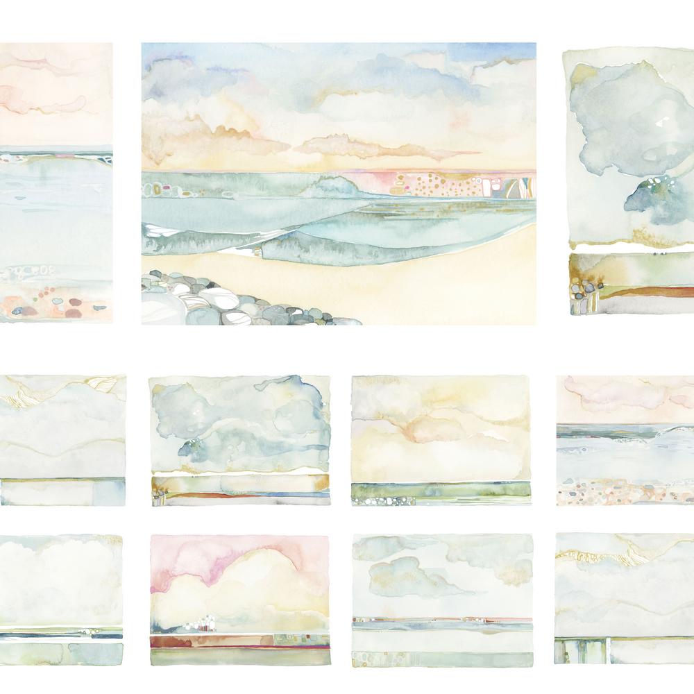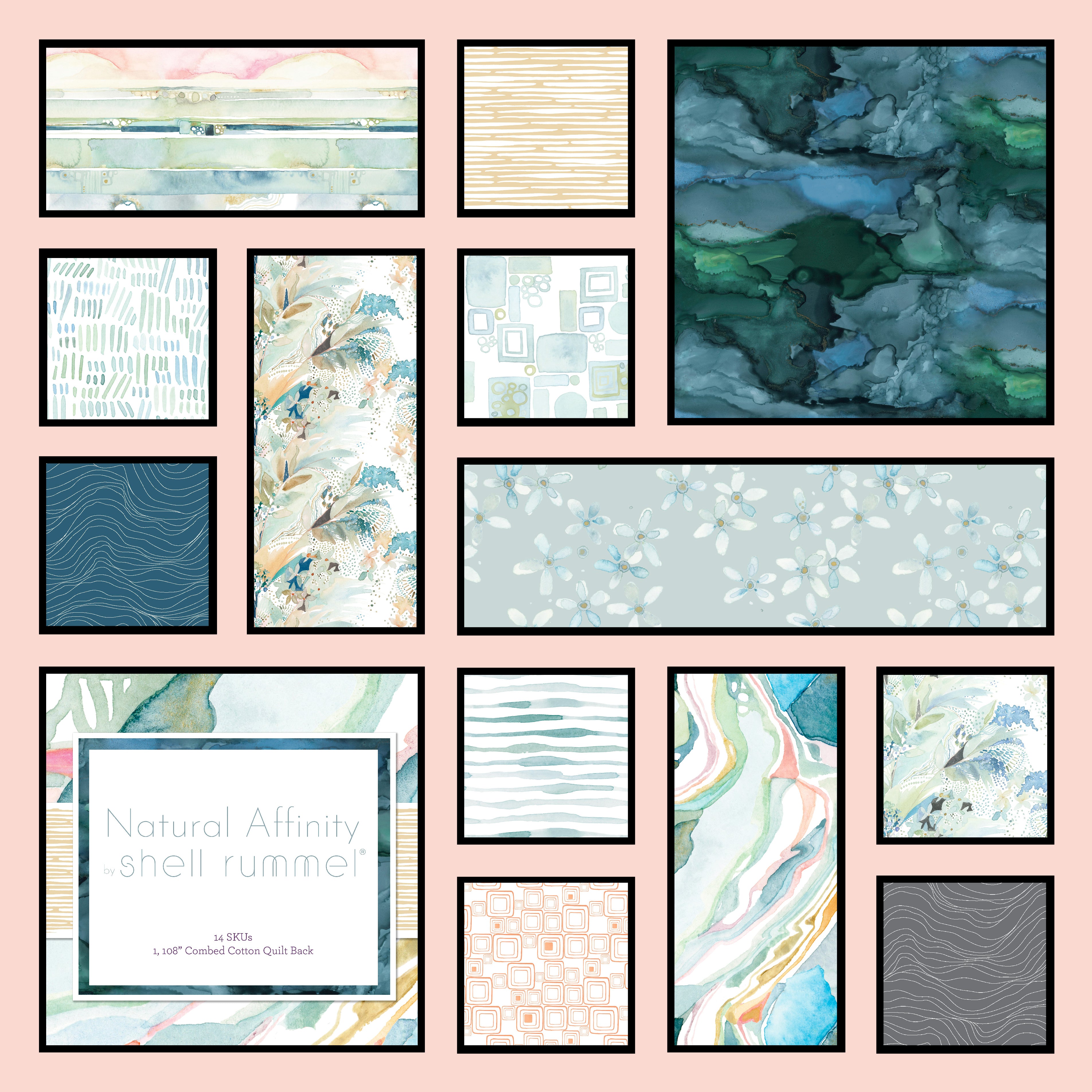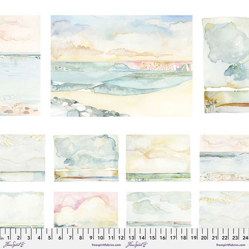 Natural Affinity by Shell Rummel. Inspired by beaches of her home on the Gulf Coast of Florida, Natural Affinity captures Shell's love of the ocean in beautiful watercolors. Her original artwork is beautifully transferred to fabric and shows details in movement of the water in blues, greens, apricot, and blush.
