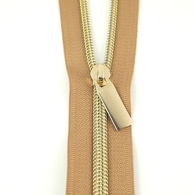 3 yards of #5 Nylon Zipper & 9 pulls - Natural tape - Gold pulls