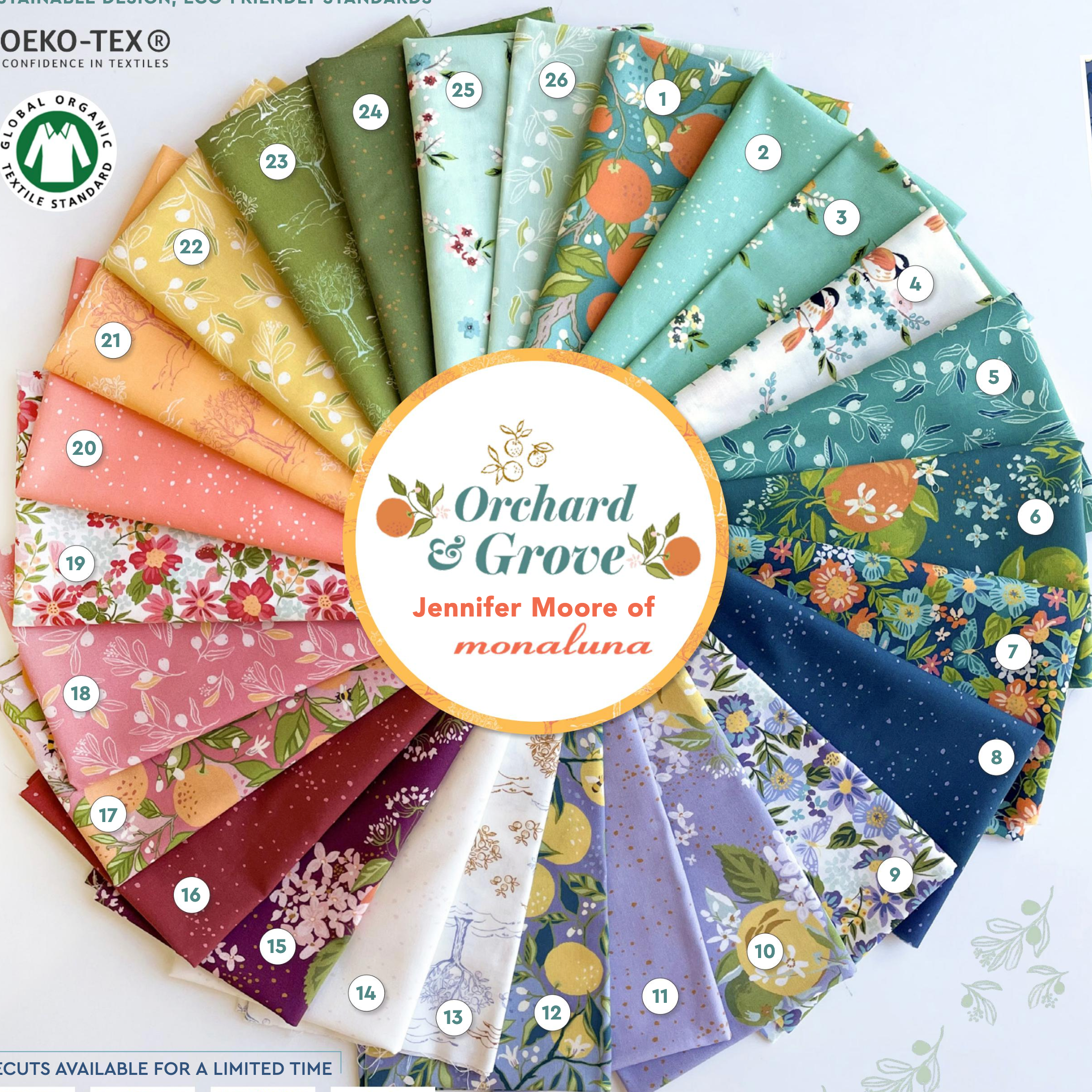 Orchard & Grove by Jennifer Moore of Monaluna for Windham Fabrics. The Orchard and Grove prints were inspired by the rolling agricultural areas of California, and the fruit trees in the designers own backyard. Her own tiny orchard is a haven for her, as well as all the bees, butterflies and birds that visit daily. This fabric is 100% Organic Cotton.