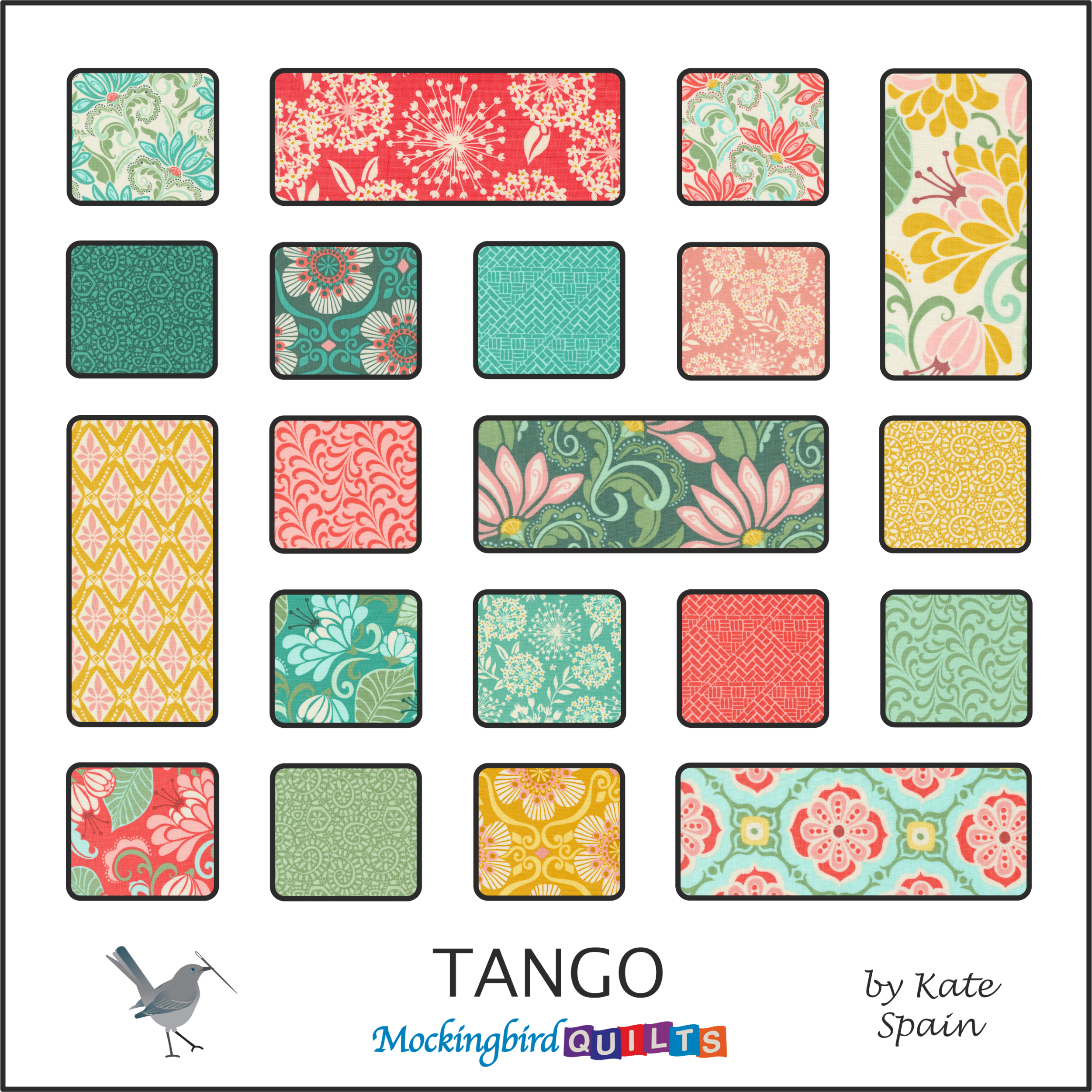 The Tango Fat Quarter Bundle includes 17 fat quarters, (18" x 21"), hand cut in our shop.  Each bundle includes one of each print shown from the Tango collection designed by Kate Spain for Moda Fabrics.