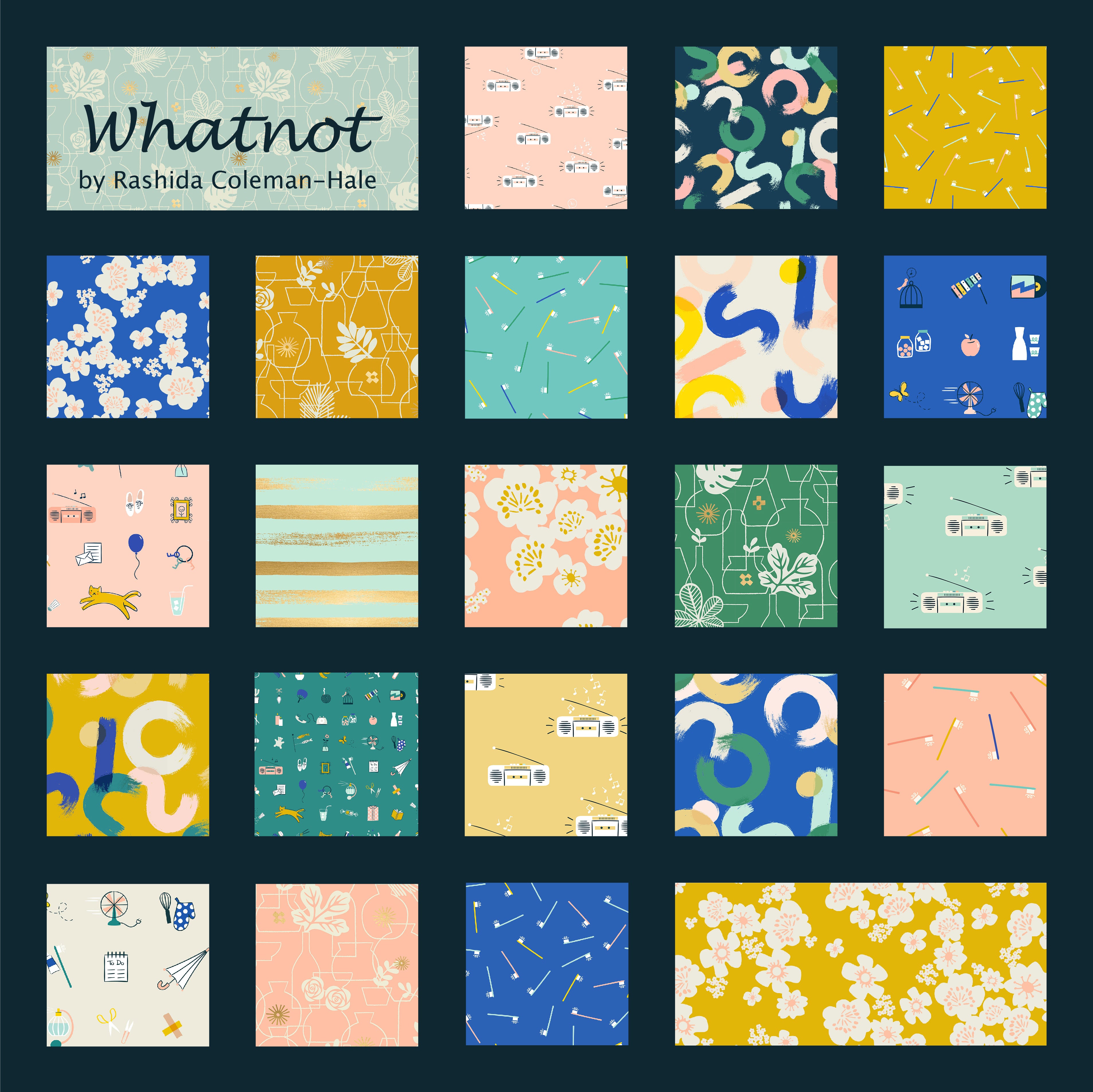 Whatnot by Rashida Coleman Hale of Ruby Star Society for Moda Fabrics. Whatnot is a playful look at everyday items in cheerful colors that will make you smile and your projects fun!