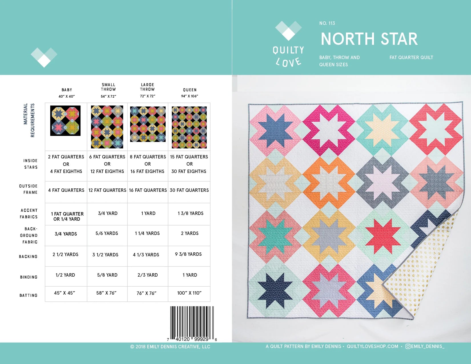 Patrón de edredón North Star de Emily Dennis de Quilty Love. Este es un edredón de estrellas moderno y es amigable con Fat Quarter y Fat Eighth. El patrón incluye instrucciones para cuatro tallas. También se supone que el quilter tiene conocimientos básicos de costura y acolchado. Requisitos de tela enumerados en el patrón. Los patrones de Quilty Love son fáciles de leer y seguir con instrucciones de corte detalladas y muchos gráficos para el alumno visual. ¡Este patrón en Warp & Weft es simplemente impresionante y no puedo esperar para hacer el mío! Fotos en Warp & Weft de Emily Dennis.