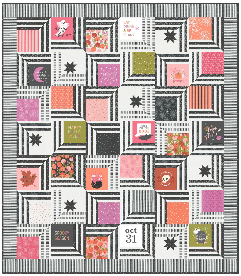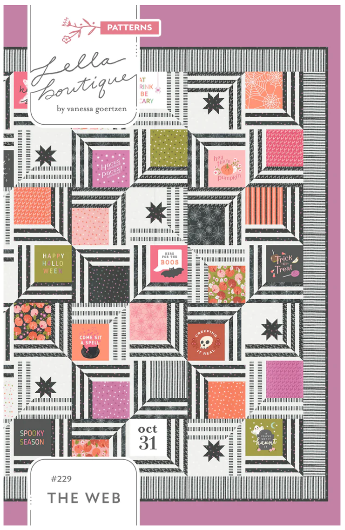 Prepárate para tejer una red de bondades quilty justo a tiempo para Halloween. Diseñado con la tela Hey Boo en mente, cada moderno bloque de colcha de red está "hilado" con un estampado o bloque de paneles favorito como punto focal. Déjate enredar en este espantosamente fabuloso viaje de mosaicos: tu corazón no podrá resistirse. Nivel de habilidad: principiante avanzado.