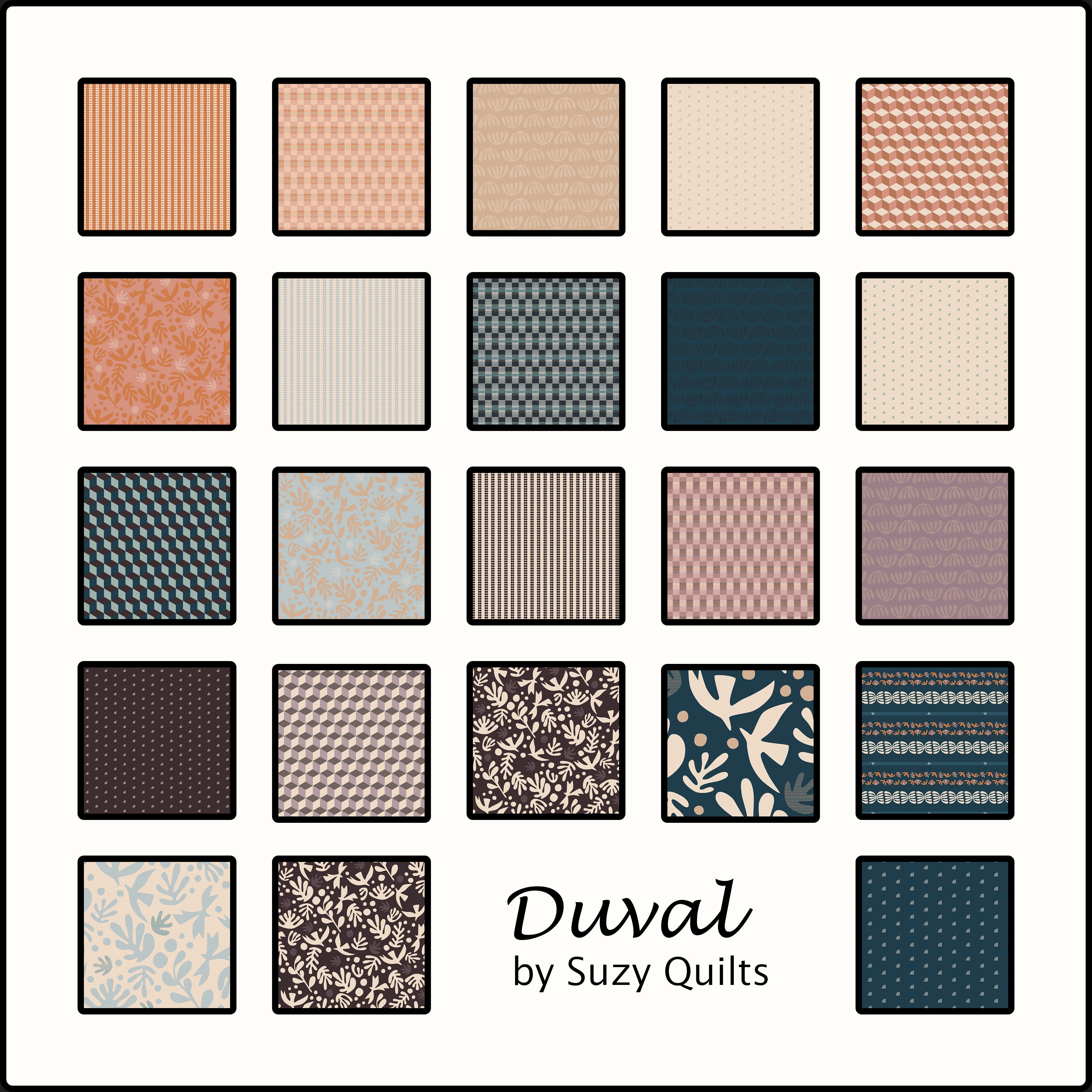 El paquete Duval Half Yard incluye 18 cortes de media yarda (18" x 44"), cortados a mano en nuestra tienda. Cada paquete incluye la línea completa, uno de cada estampado de la colección Duval de Suzy Quilts para Art Gallery Fabrics. La tela de encuadernación "Key West Bound" está disponible por separado.