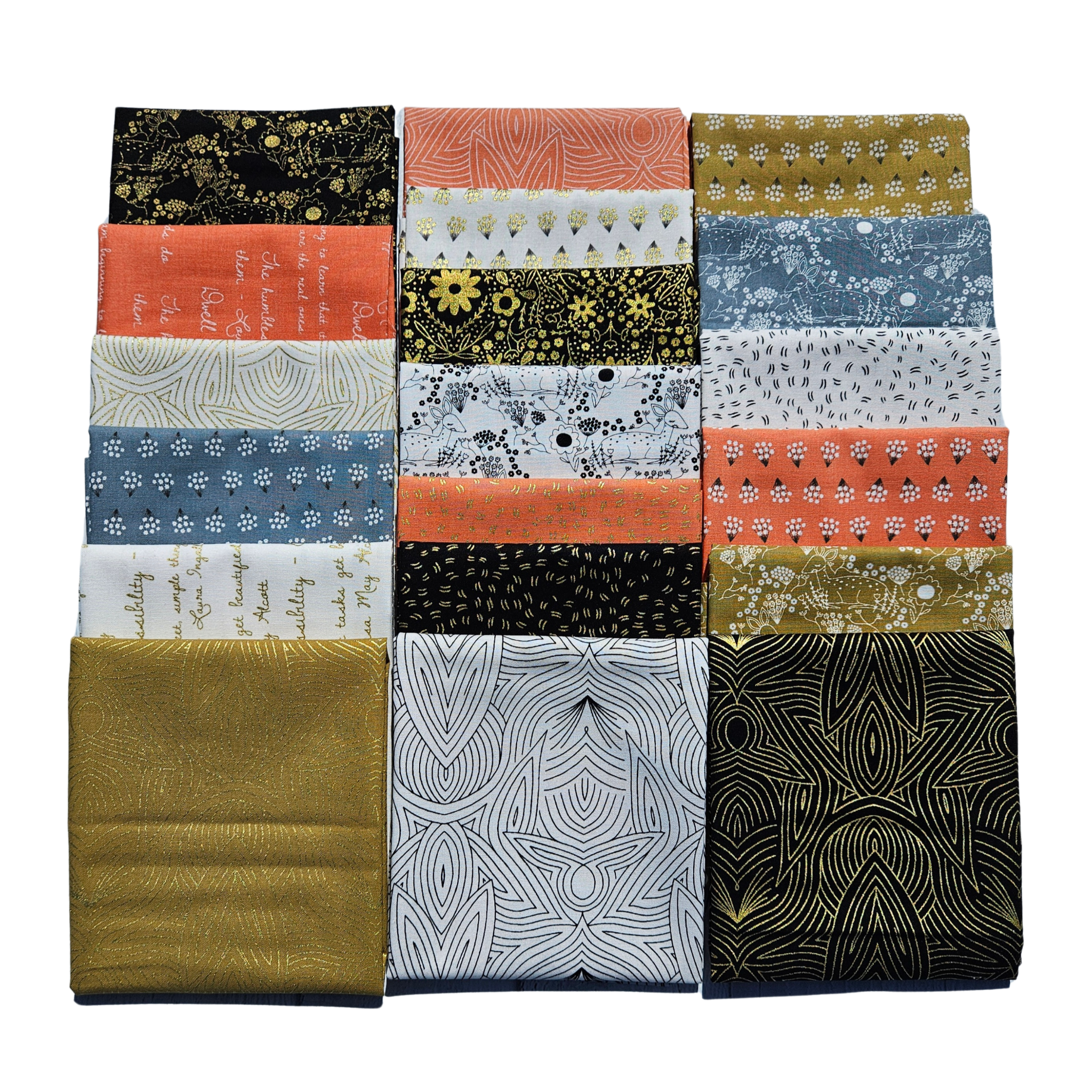 El paquete Dwell in Possibility Fat Quarter incluye 26 cuartos gordos (18" x 21"), uno de cada estampado mostrado de la colección Dwell in Possibility de Gingiber para Moda Fabrics.
