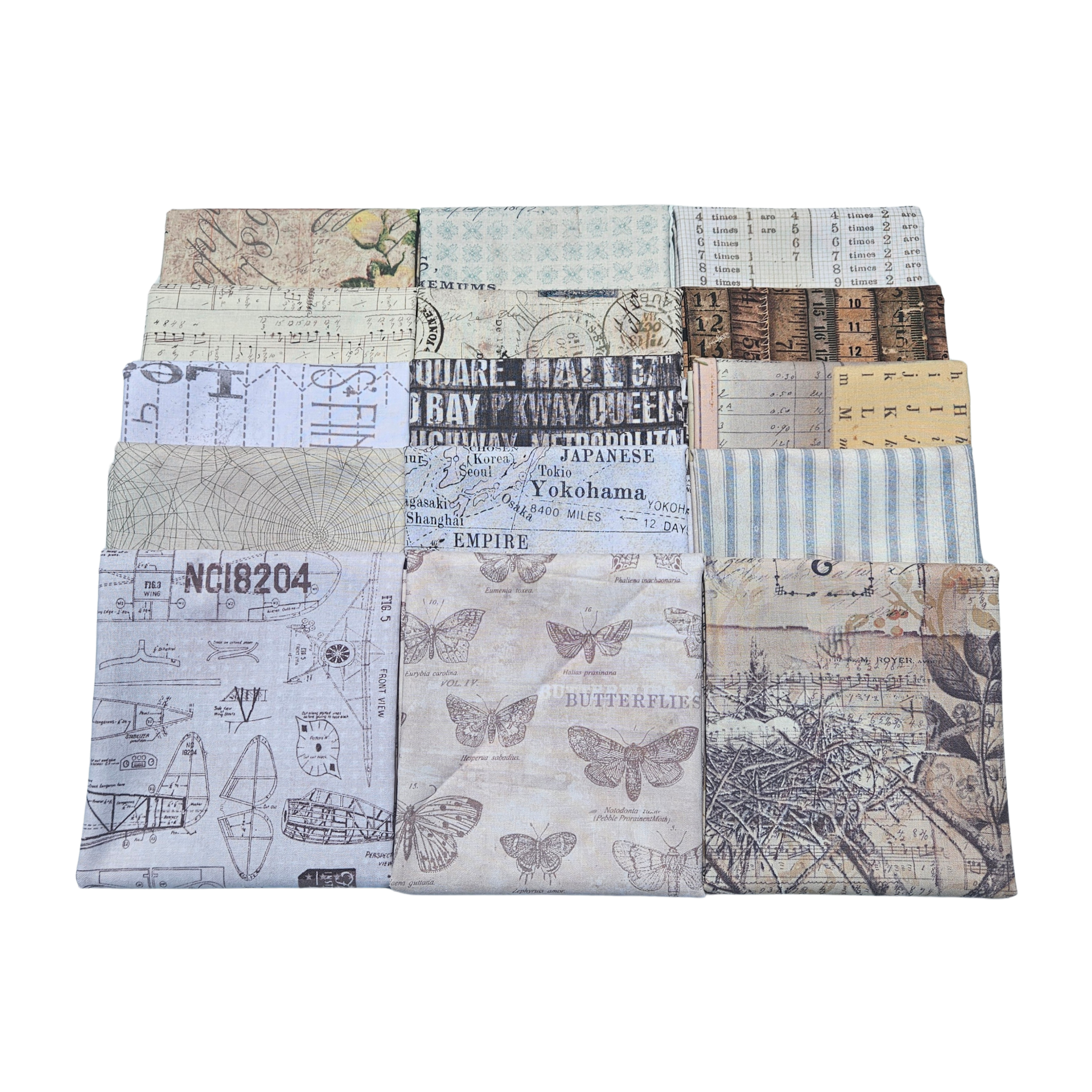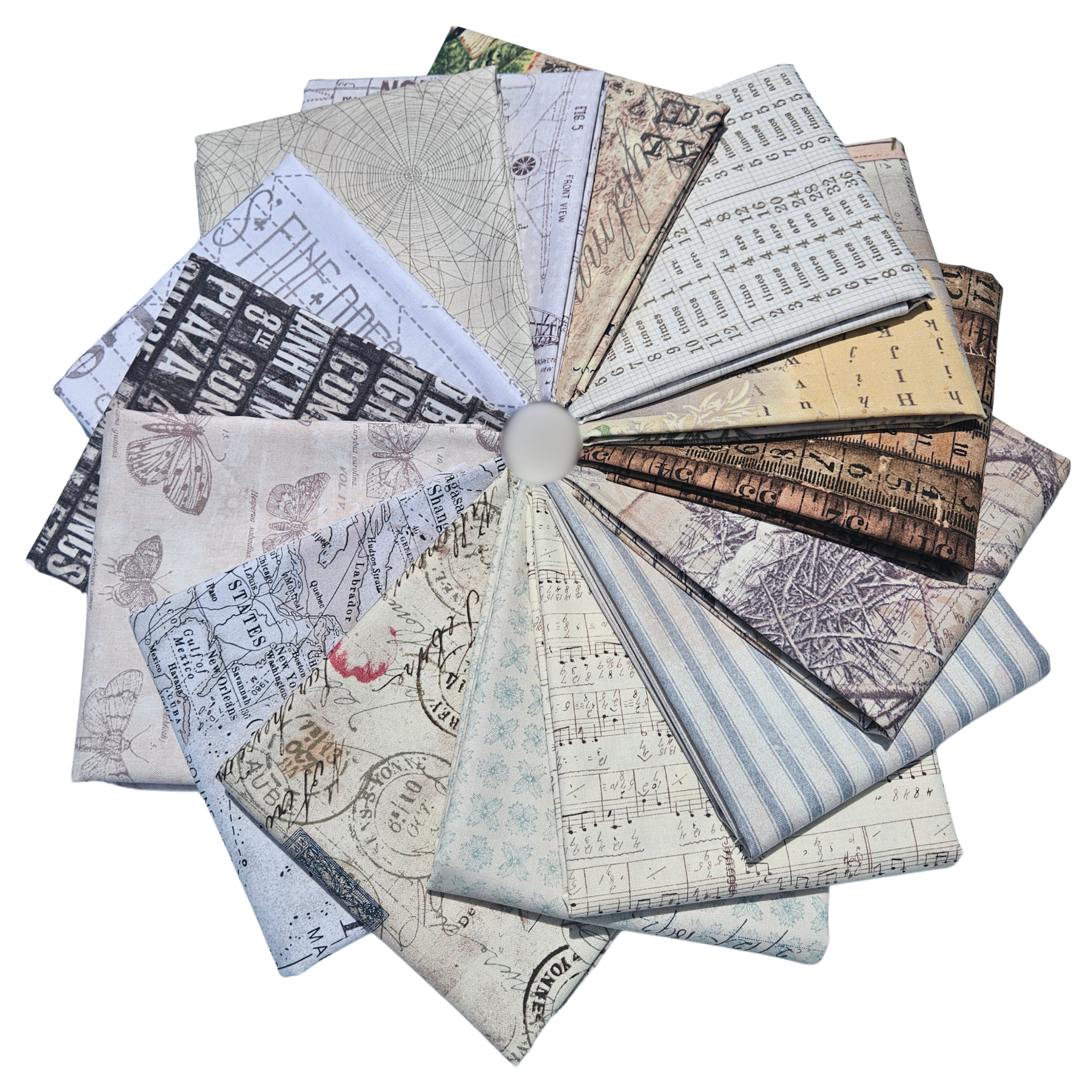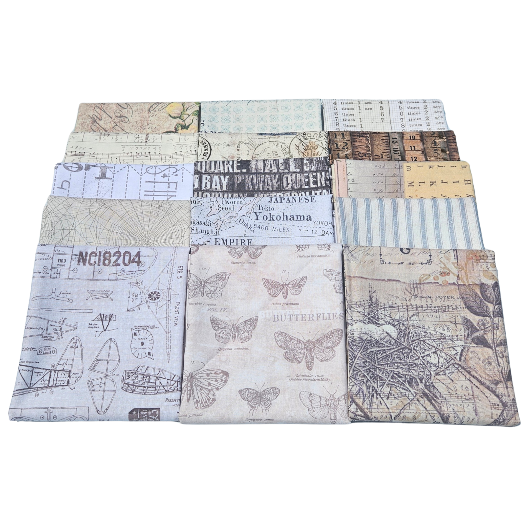 Elementos eclécticos monocromáticos, diseñados por Tim Holtz para Free Spirit Fabrics. Con sus elementos artísticos característicos en tonos neutros que crean la sutileza de Monochrome.