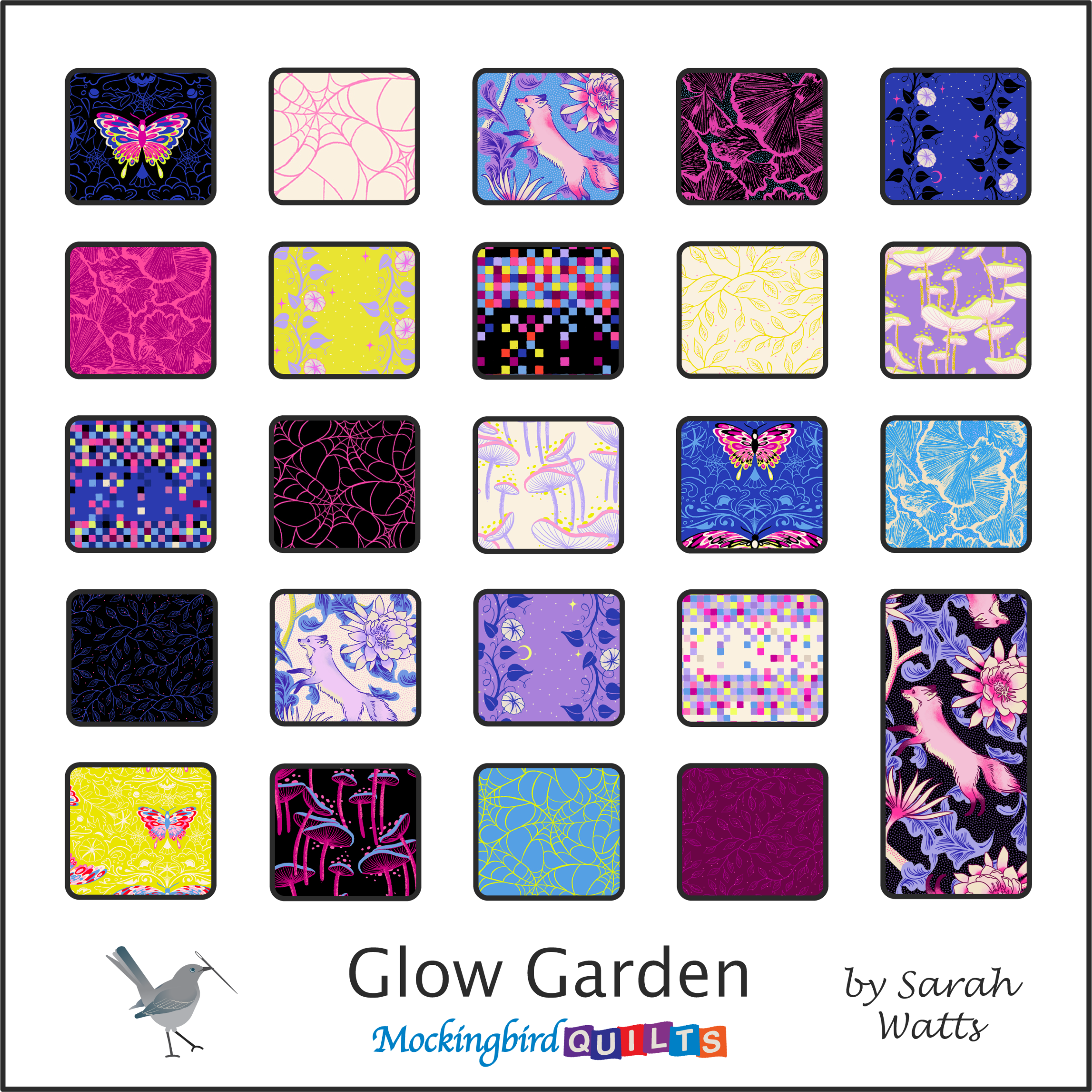 The Glow Garden 24pc Fat Quarter bundles, (18" x 21"); are hand cut in our shop. Each bundle includes one of each print shown in the Glow Garden collection designed by Sarah Watts of Ruby Star Society. Panel available separately.