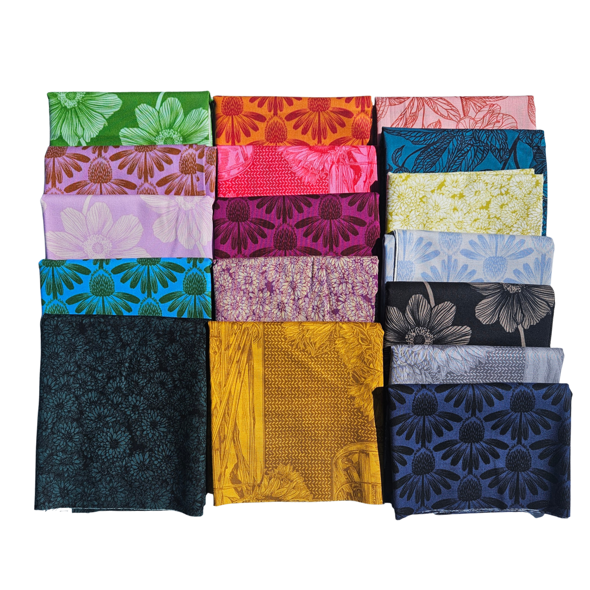 This Indelible Remnants Bundle includes 17 pieces, ranging in size from 8" to 16", for a total of ~5 yards, 11 inches. The bundle includes one of each fabric shown from the Indelible collection by Anna Maria Textiles for Northcott Fabrics.