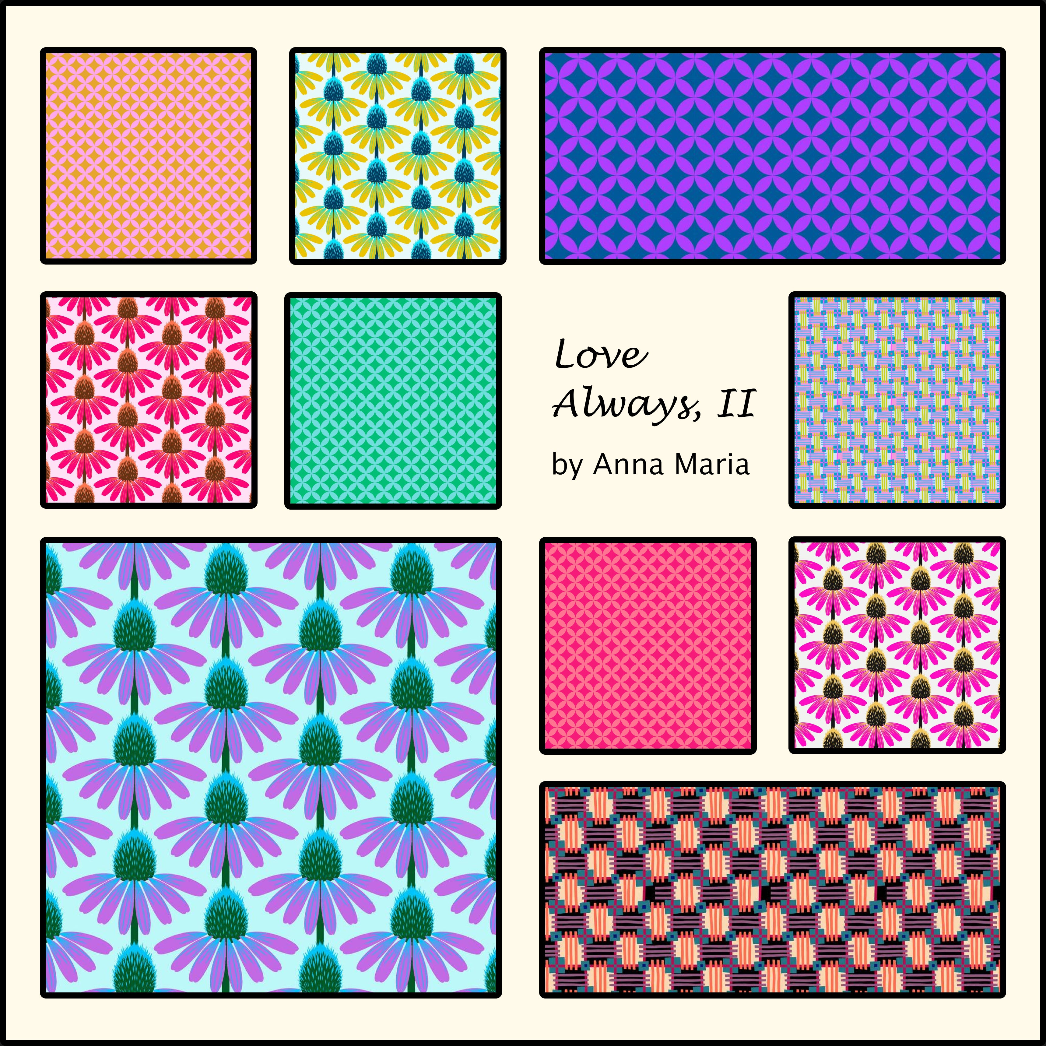 El paquete Love Always II, AM Half Yard incluye 10 cortes de media yarda (18" x 44"), cortados a mano en nuestra tienda. Cada paquete incluye la línea completa, uno de cada estampado de la colección Love Always II, AM diseñada por Anna Maria.