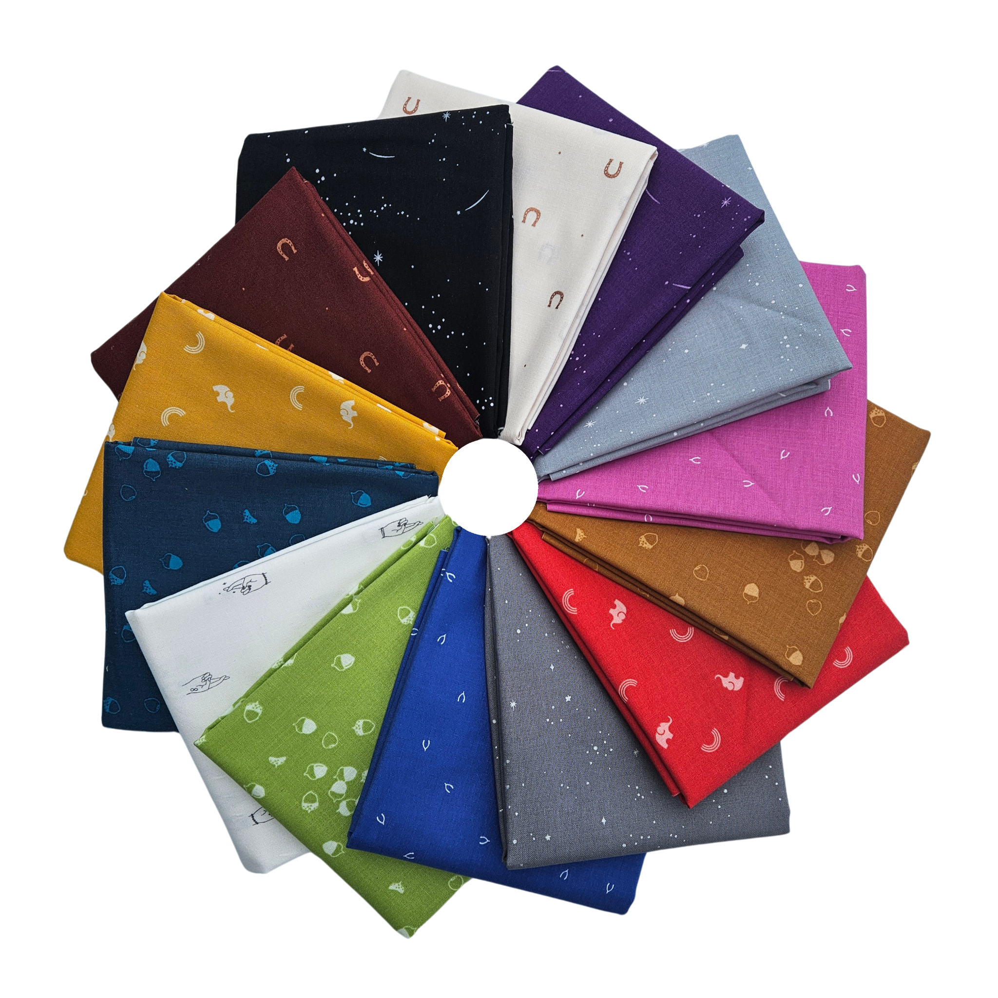 El paquete Lucky Charms Half Yard incluye 15 cortes de media yarda (18" x 44"), uno de cada impresión fotografiada de la colección Lucky Charms de Ghazal Razavi de Figo Studio.
