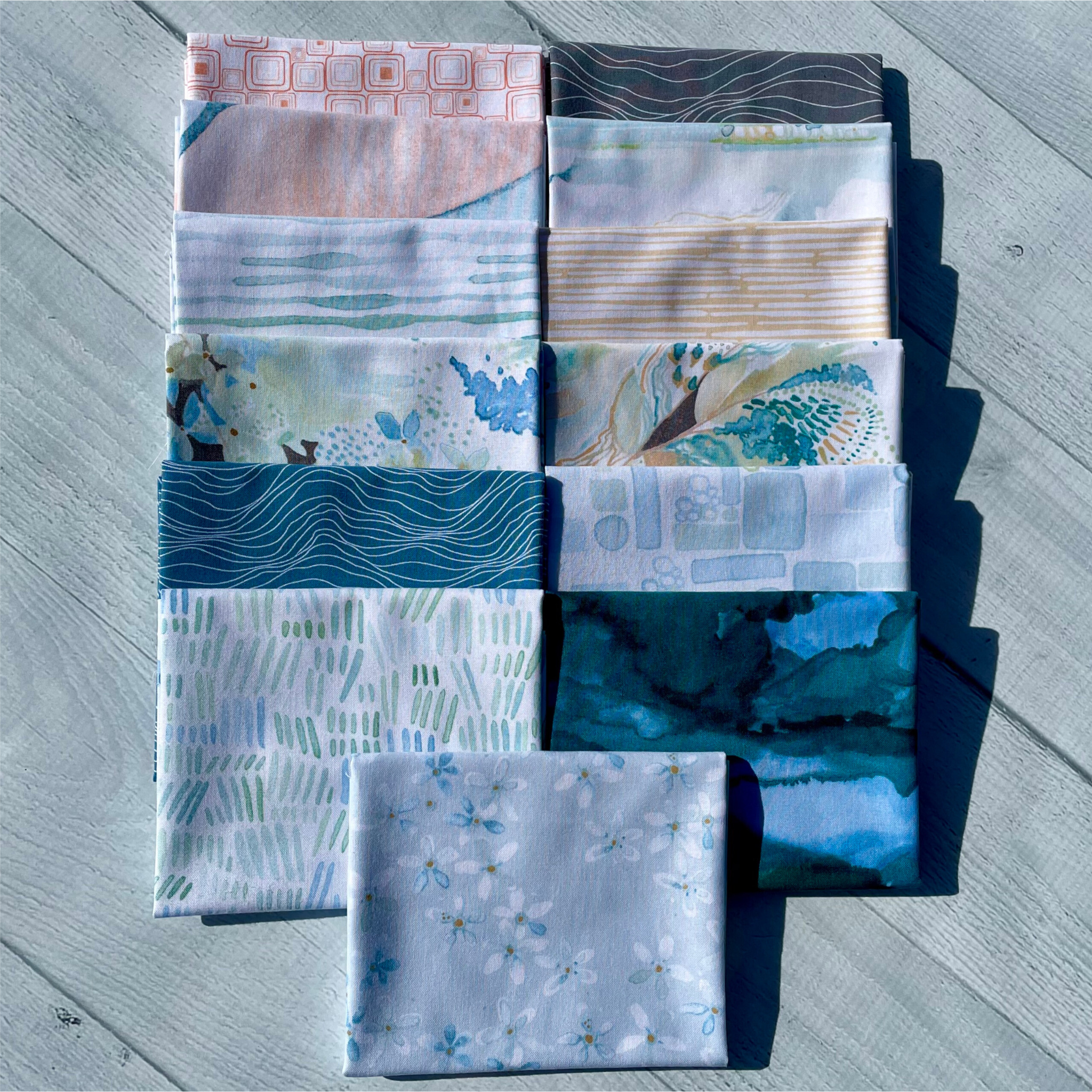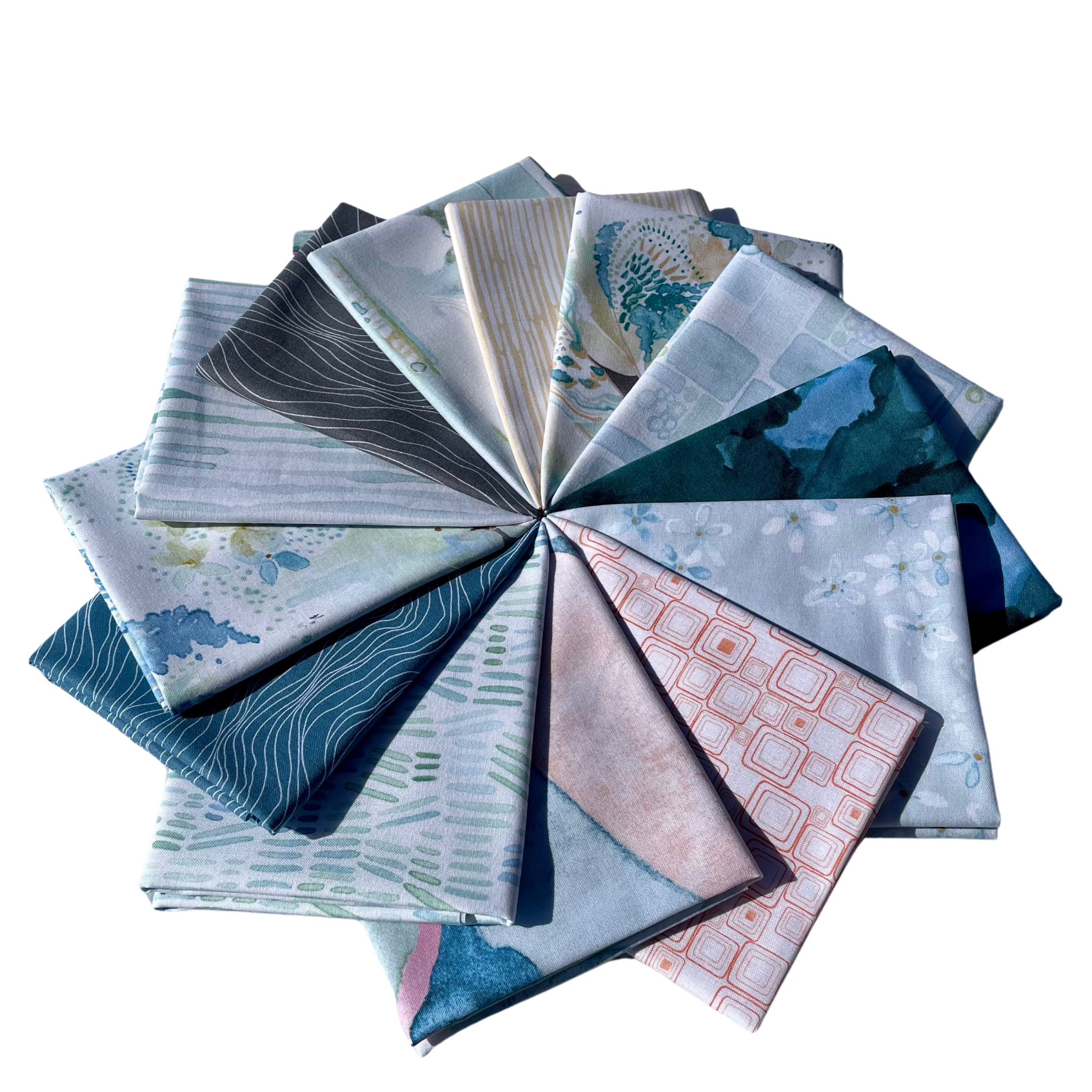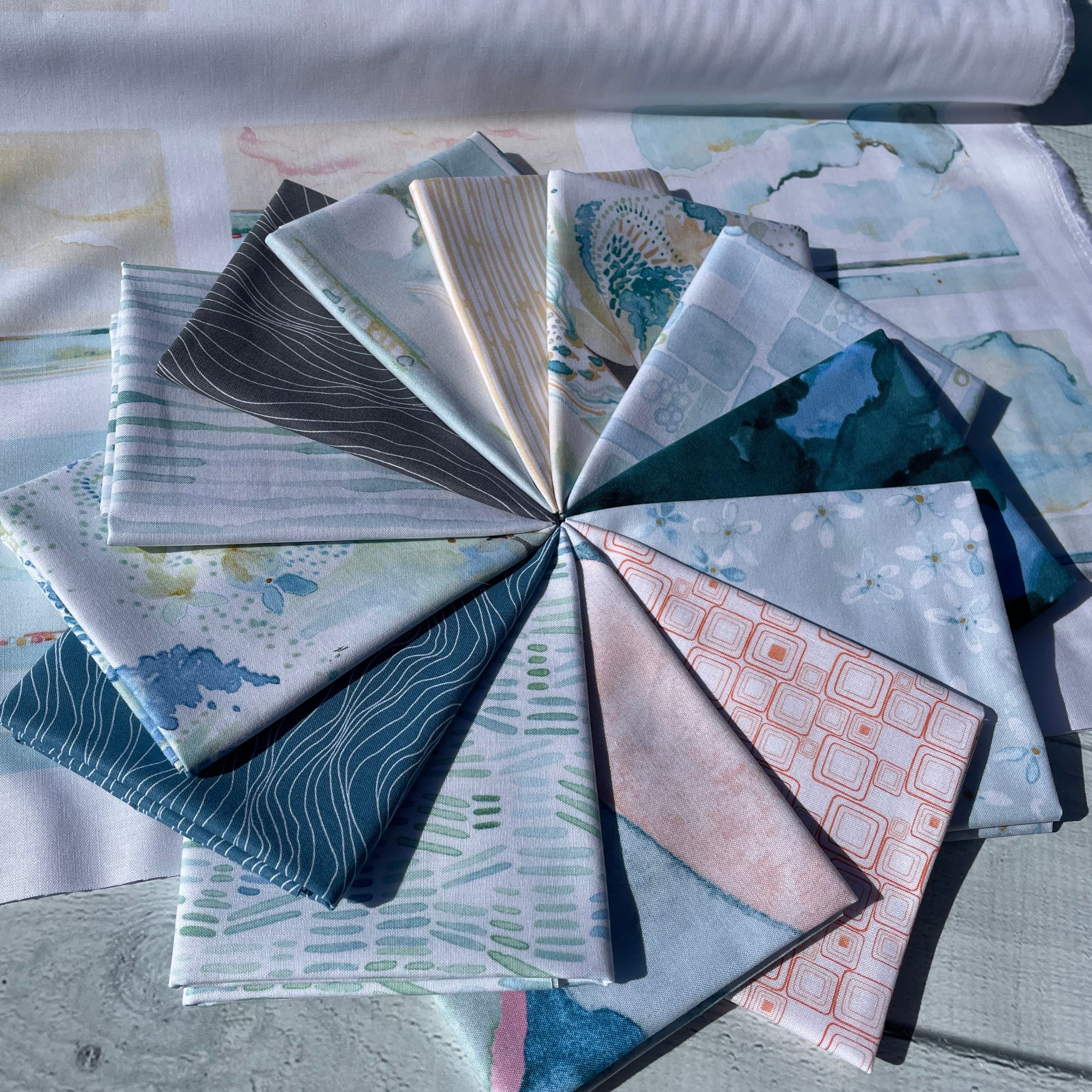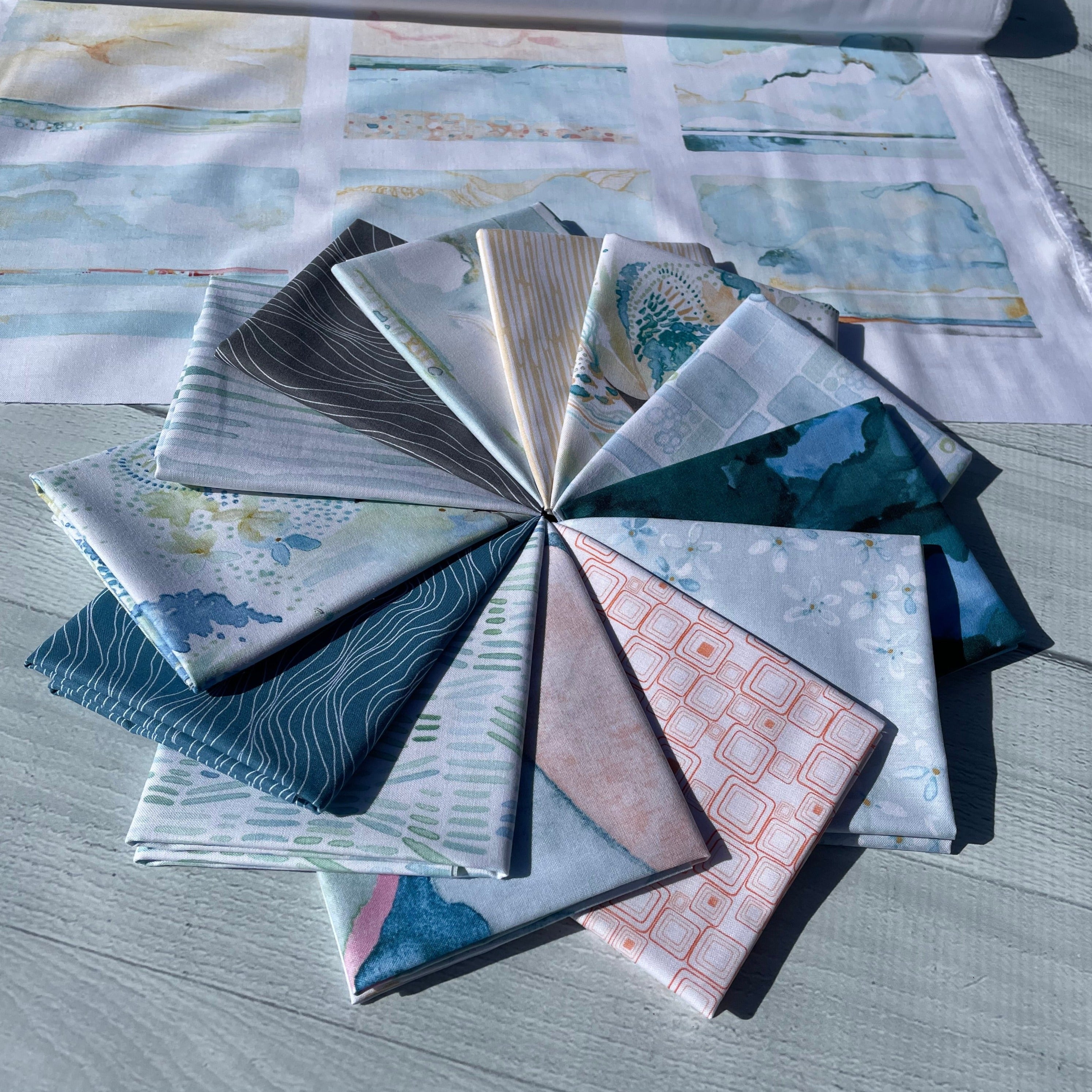 El paquete Natural Affinity Half Yard incluye 13 cortes de media yarda (18" x 44"), uno de cada estampado de la colección Natural Affinity más el panel diseñado por Shell Rummel para FreeSpirit Fabrics.