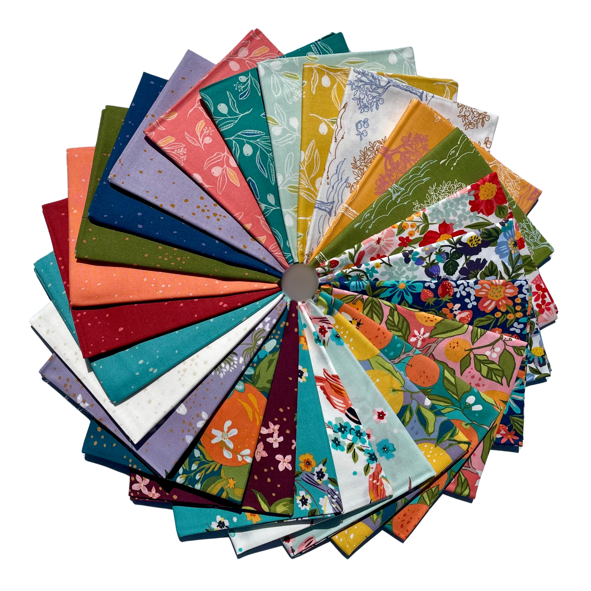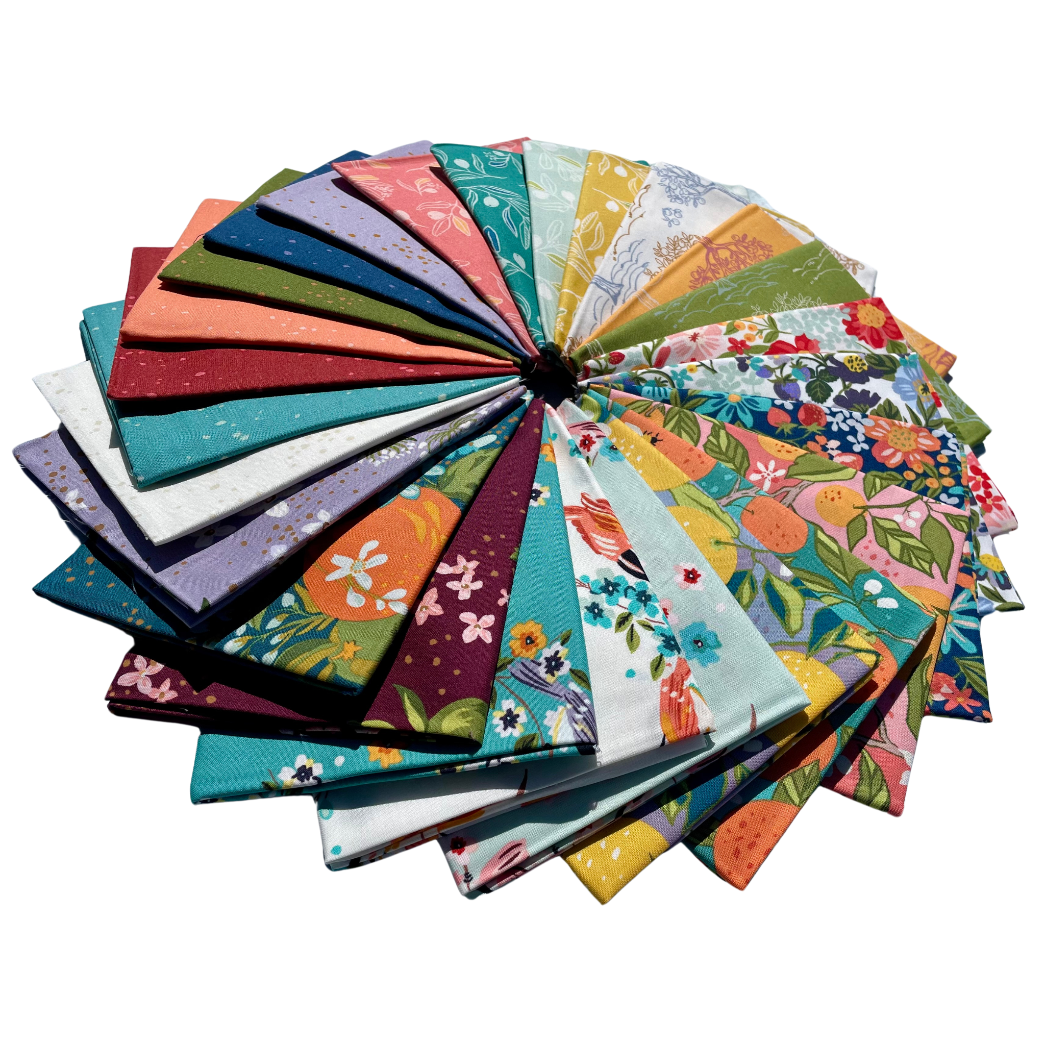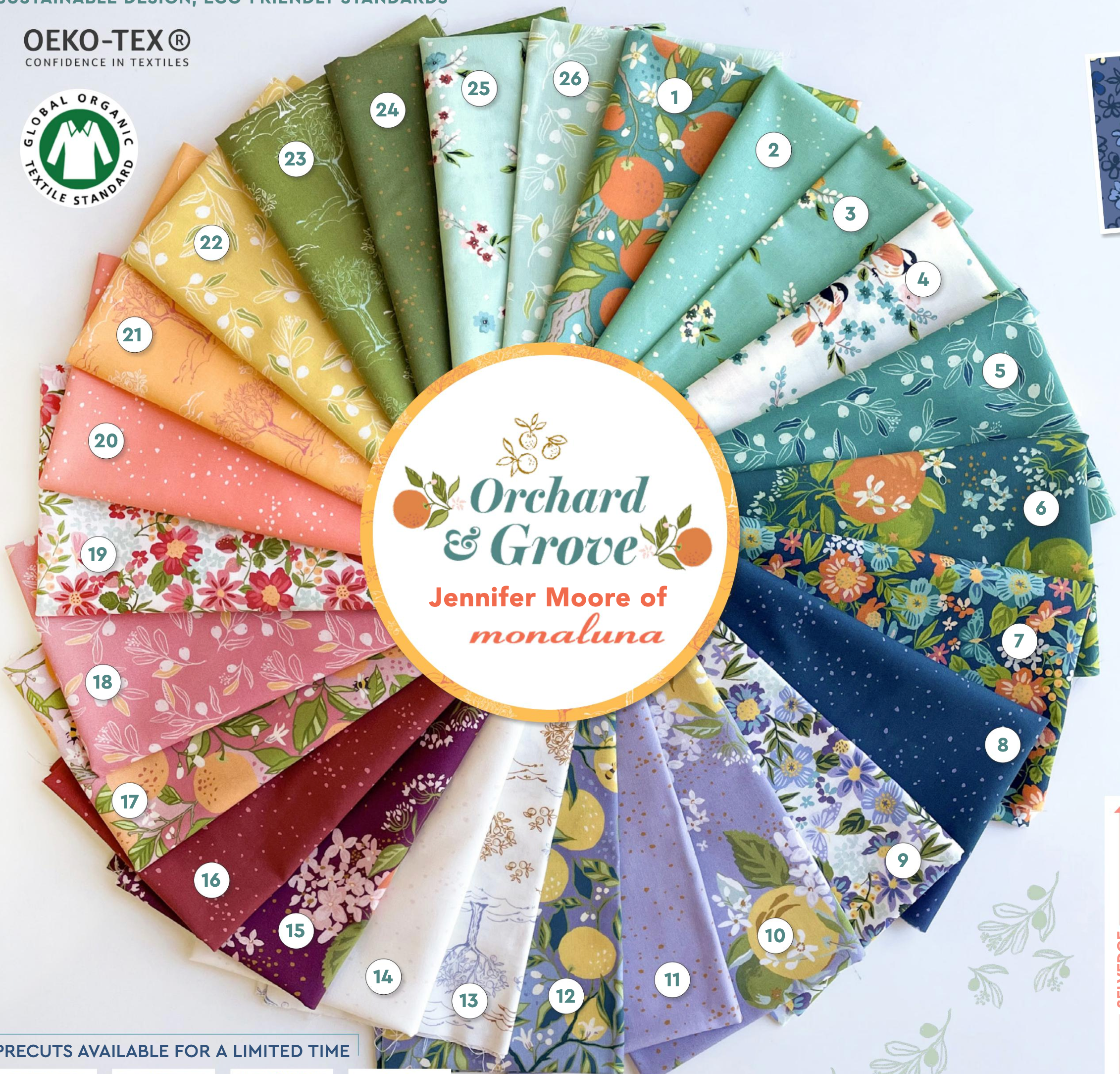Orchard & Grove de Jennifer Moore de Monaluna para Windham Fabrics. Los estampados de Orchard y Grove se inspiraron en las onduladas zonas agrícolas de Californiay en los árboles frutales del patio trasero del propio diseñador. Su propio pequeñohuerto es un refugio para ella, así como para todas las abejas, mariposasy pájaros que lo visitan a diario. Este tejido es 100% Algodón Orgánico.