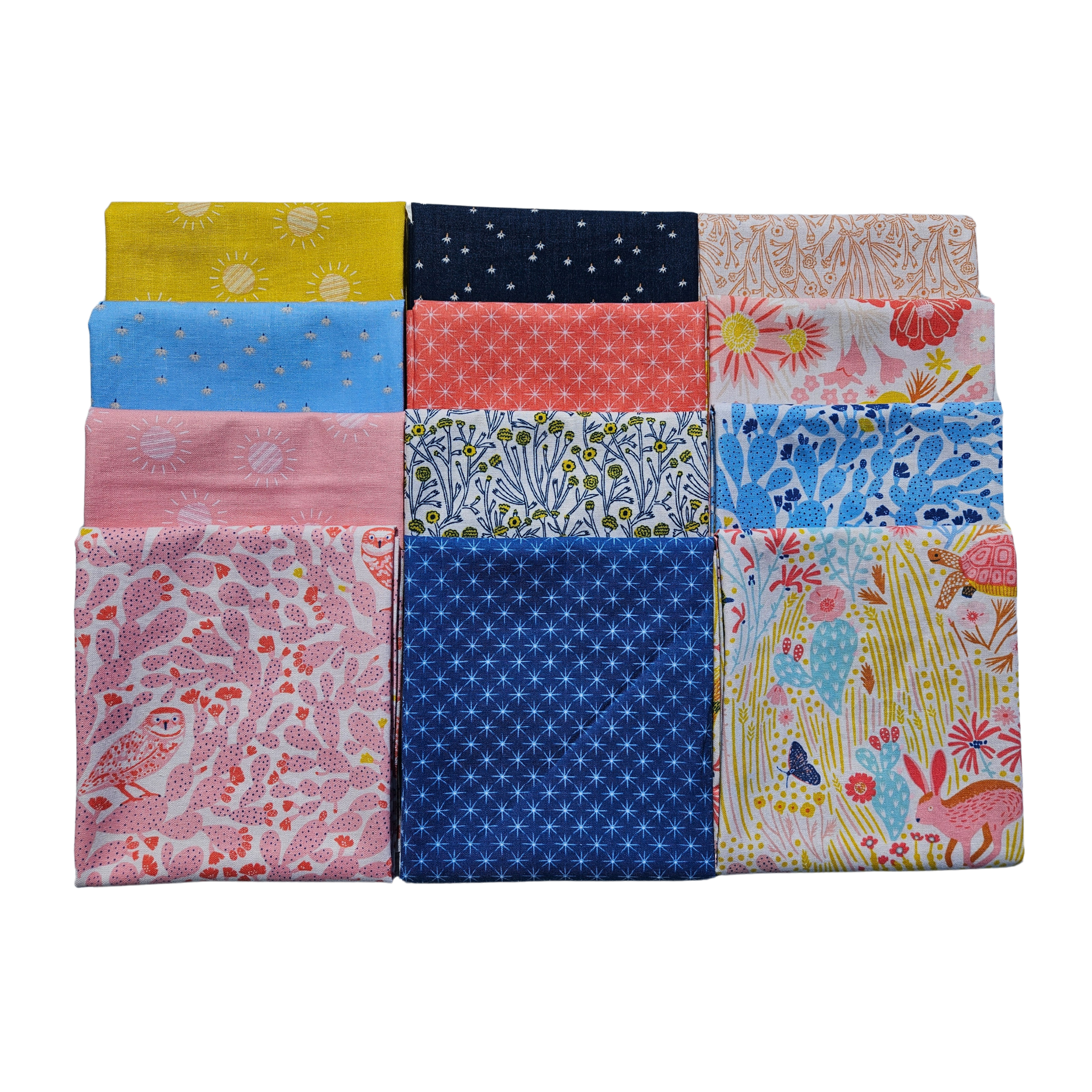El paquete Prickly Pear Fat Quarter incluye 14 cuartos gordos (18" x 22"), uno de cada estampado de la colección Prickly Pear diseñado por Emily Taylor para Figo Fabrics.