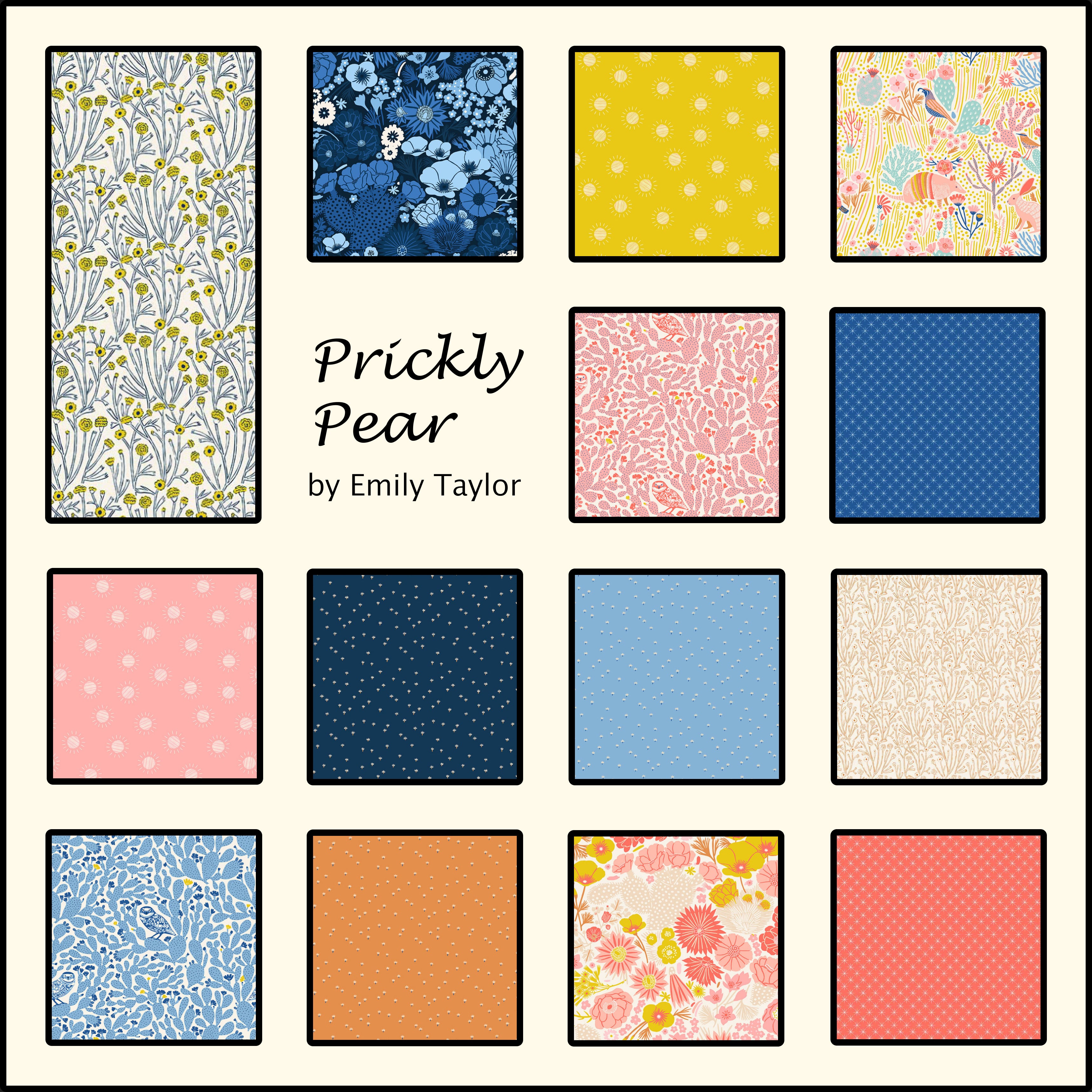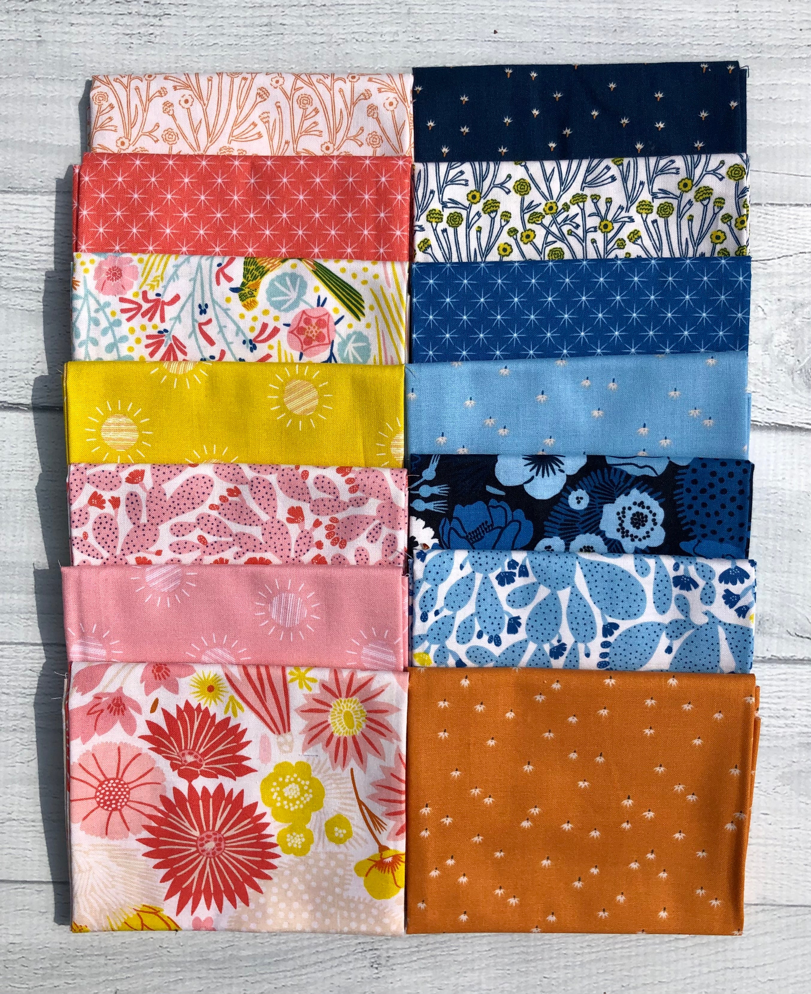 El paquete Prickly Pear Half Yard incluye 14 cortes de media yarda (18" x 44"), uno de cada estampado de la colección Prickly Pear diseñado por Emily Taylor para Figo Fabrics.