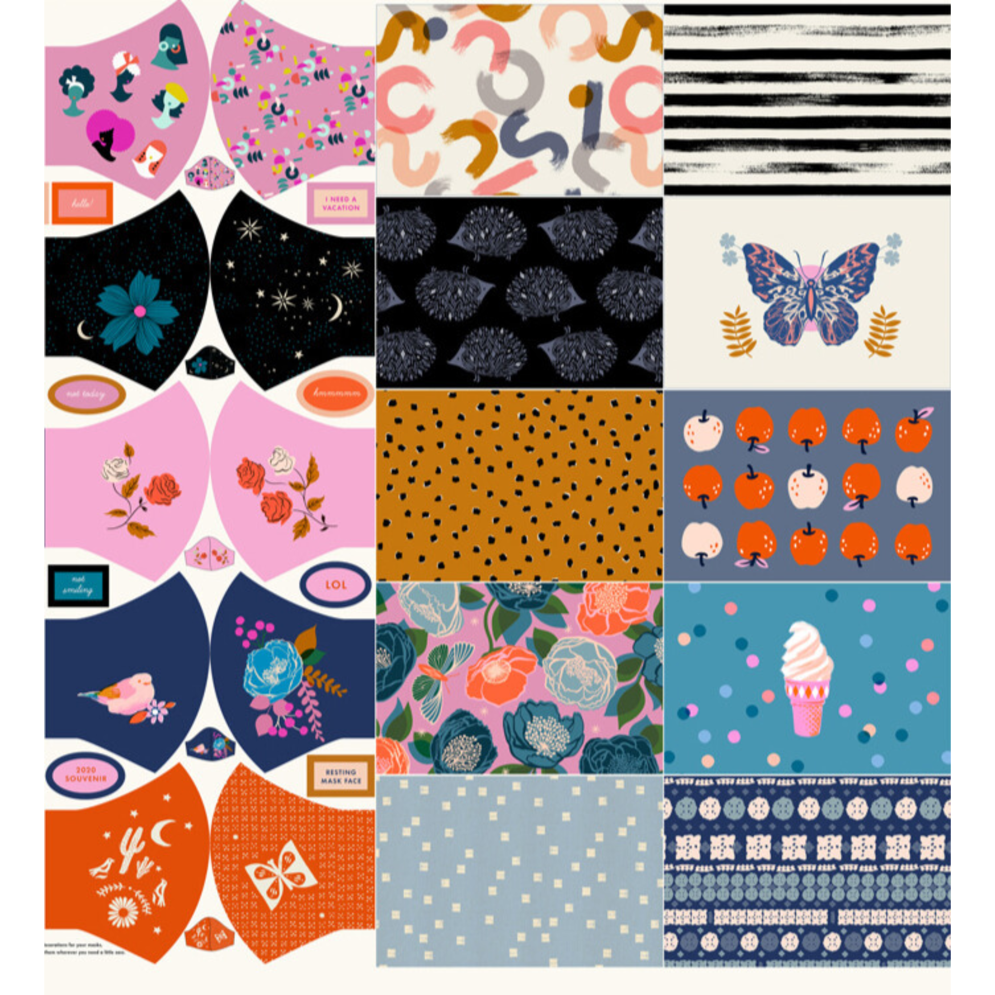 El panel hace 10 máscaras por sí solo o 20 máscaras si agrega forro adicional. El panel incluye instrucciones de tela y costura tanto para las máscaras curvas reversibles como para las máscaras rectangulares plisadas. Las mascarillas rectangulares se pueden fabricar tanto en talla de adulto como de niño. Varios paneles comprados se cortarán por separado a menos que se solicite lo contrario.