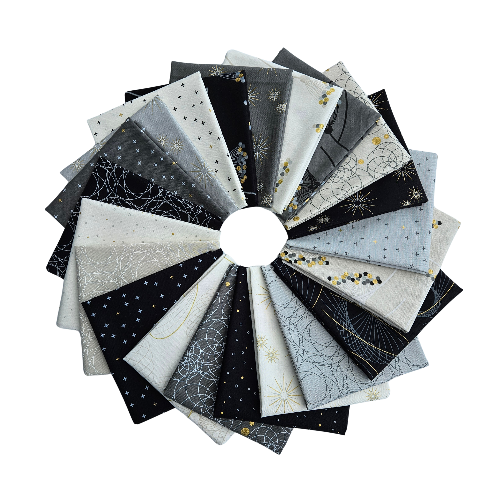 El paquete Flirtation Fat Quarter incluye 24 cuartos gordos (18" x 21"), uno de cada estampado mostrado de la colección Flirtation diseñada por Brigitte Heitland para Moda Fabrics.