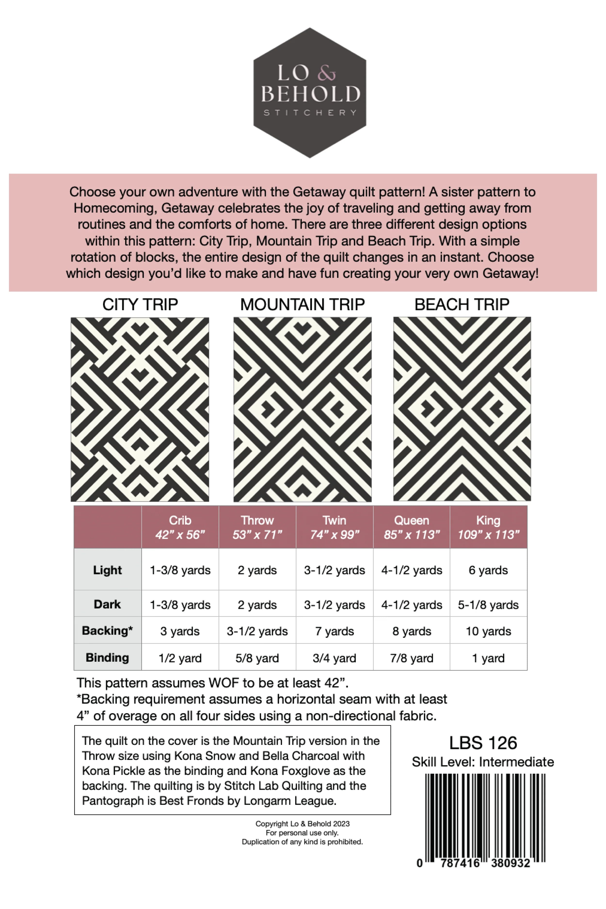 Choisissez votre propre aventure avec le motif de courtepointe Getaway ! Modèle sœur de Homecoming, Getaway célèbre la joie de voyager et de s'éloigner de la routine et du confort de la maison. Il existe trois options de conception différentes dans ce modèle. City Trip, Mountain Trip et Beach Trip. Avec une simple rotation des blocs, le design complet de la courtepointe change en un instant. Choisissez le design que vous souhaitez réaliser et amusez-vous à créer votre propre escapade !