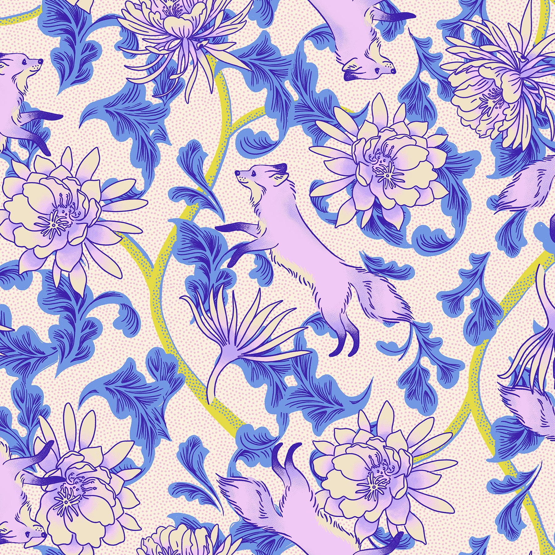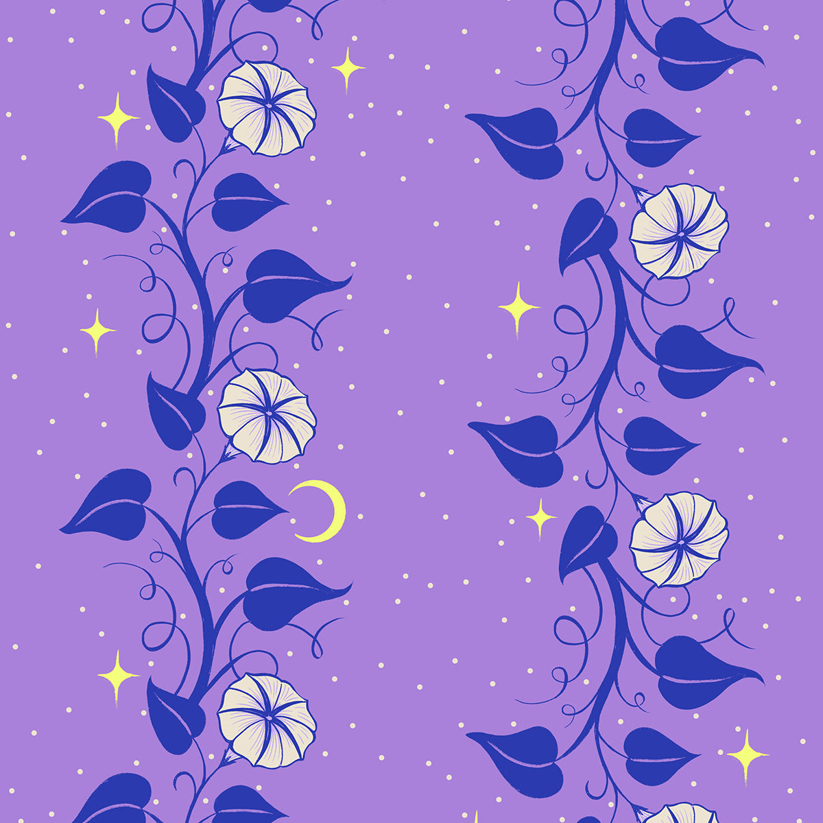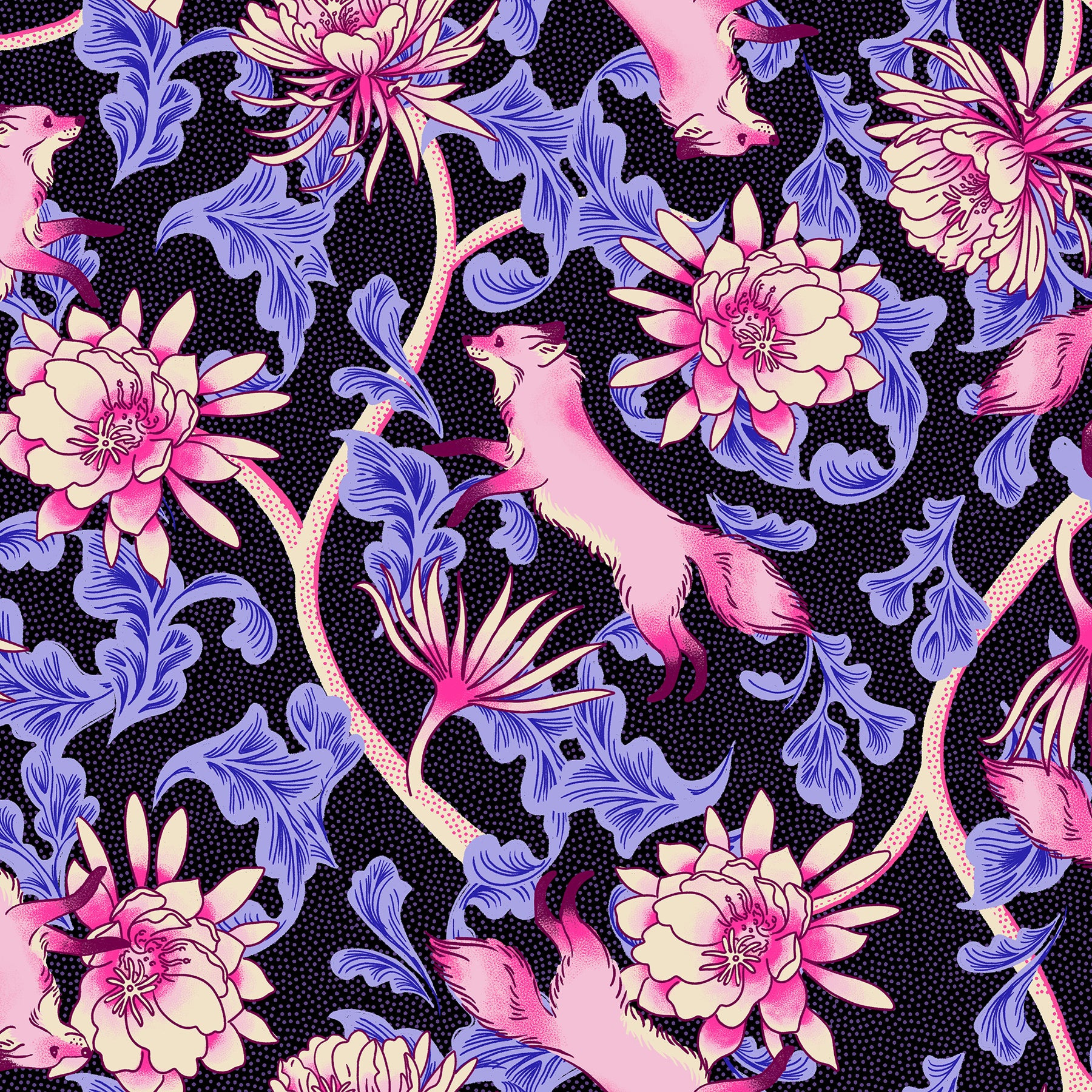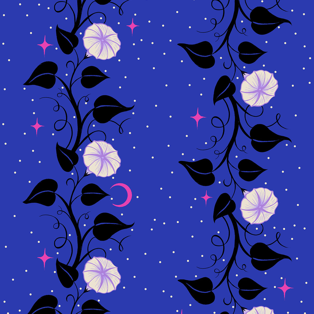 Glow Garden by Sarah Watts is a collection inspired by the magical, phosphorescent vibes of a fairy garden and a neon palette that glows in the dark. Each print captures the wild blend of nature and luminescence, bringing the thrill of a blacklight roller rink and the enchantment of a night garden.