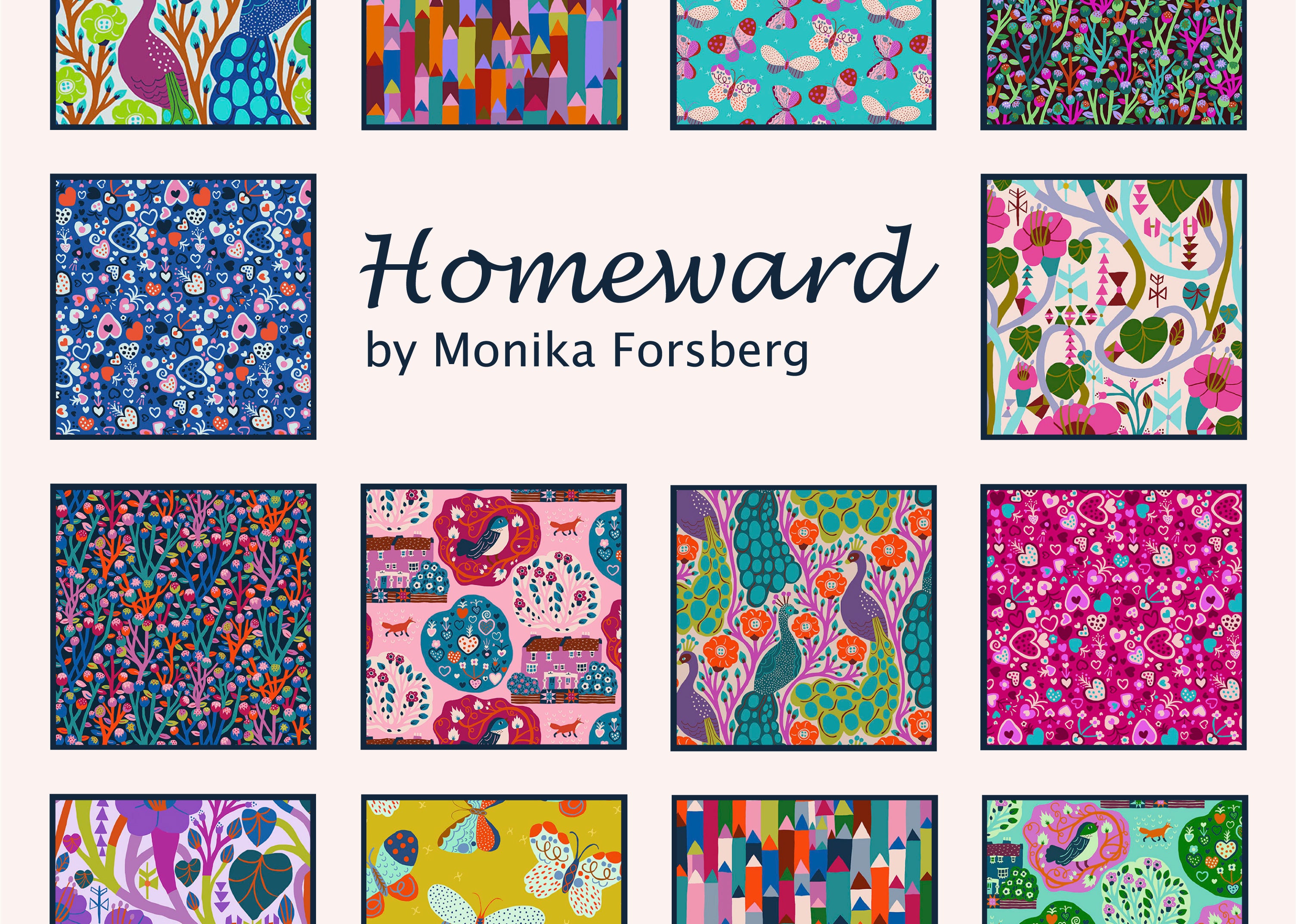 Homeward conçu par Monika Forsberg est le dernier opus de la collection Conservatory Craft d'Anna Maria Horner et FreeSpirit Fabrics. Monika nous invite à prendre la direction de « Homeward ». Le lieu, la mémoire, les sentiments évoqués par Home. « La maison est notre cœur et ce qui nous y retient ». Suivez les sentiers sinueux avec des vignes, des fleurs et des papillons aux magnifiques tons de bijoux.