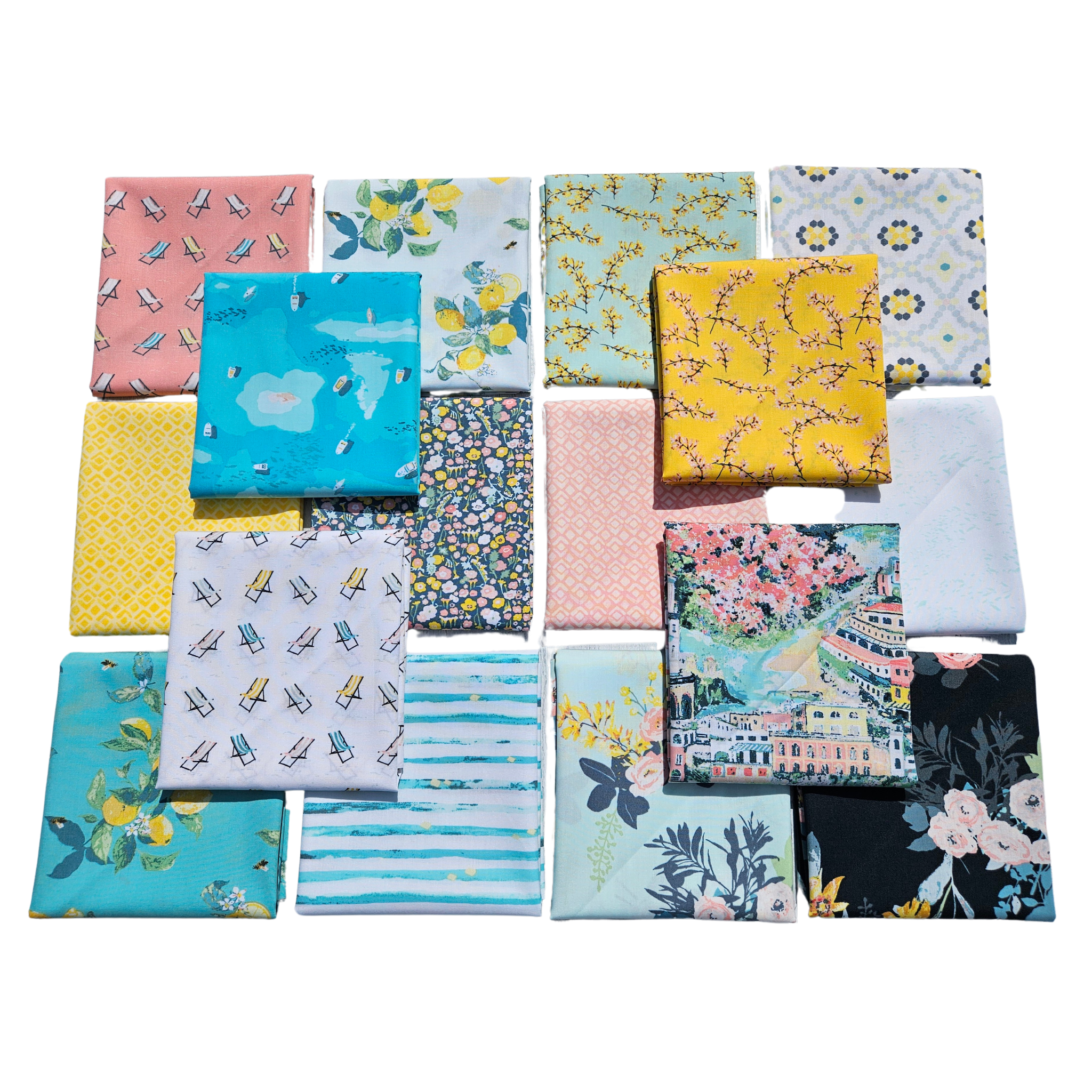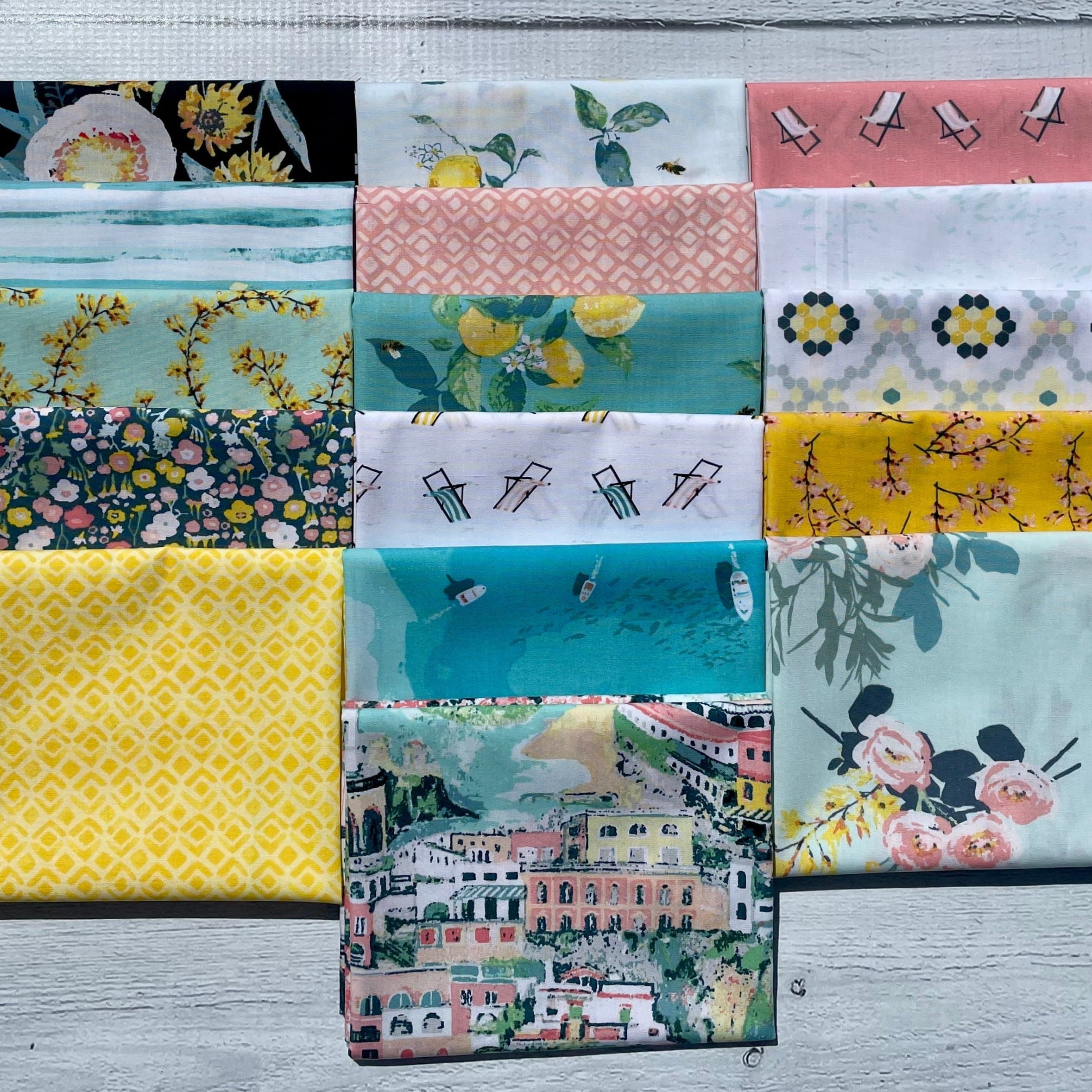 Les lots Capri Half Yard sont coupés à la main dans notre boutique et comprennent 16 coupes d'un demi-mètre (18" x 44"), une de chaque impression de la collection Capri conçue par Katarina Roccella pour Art Gallery Fabrics.