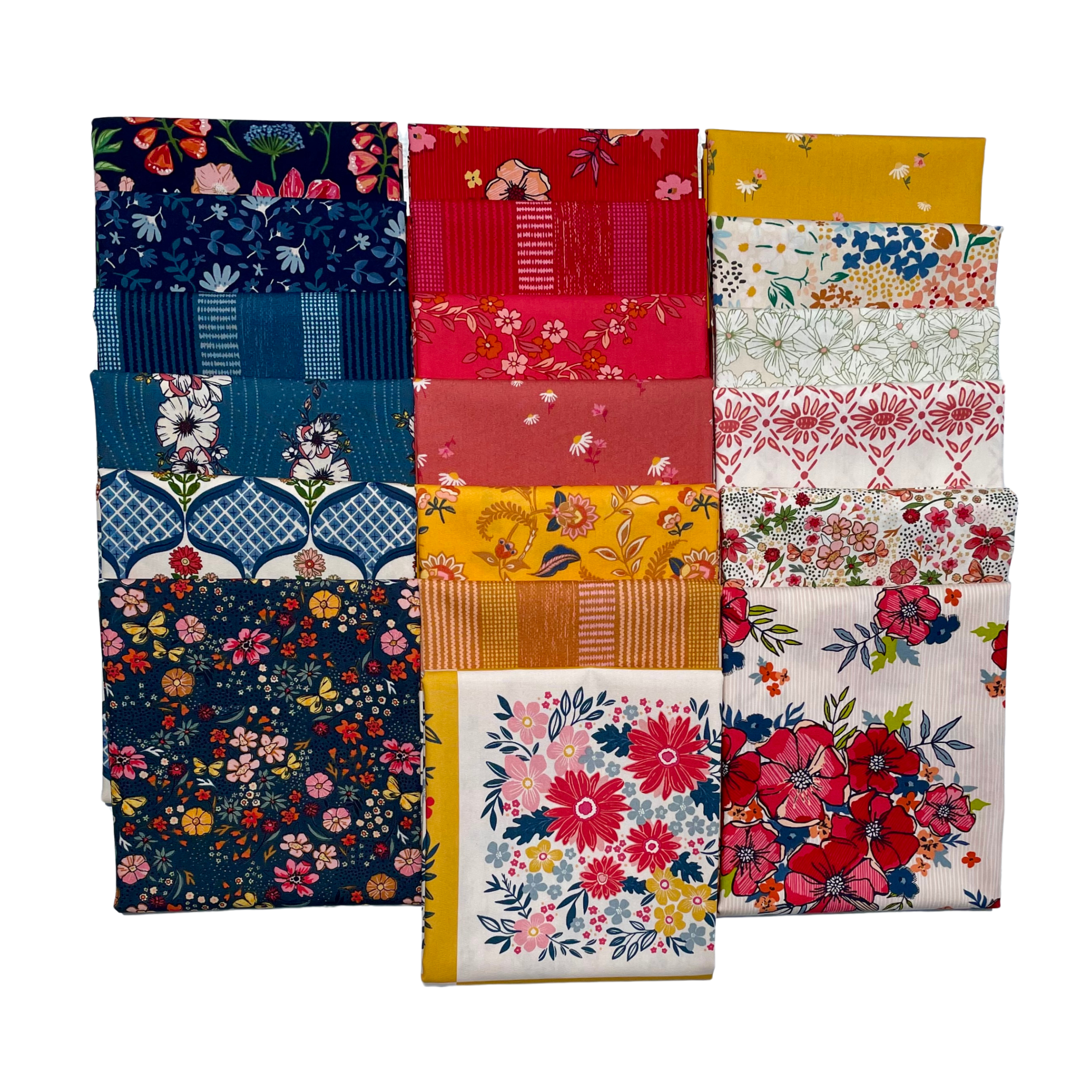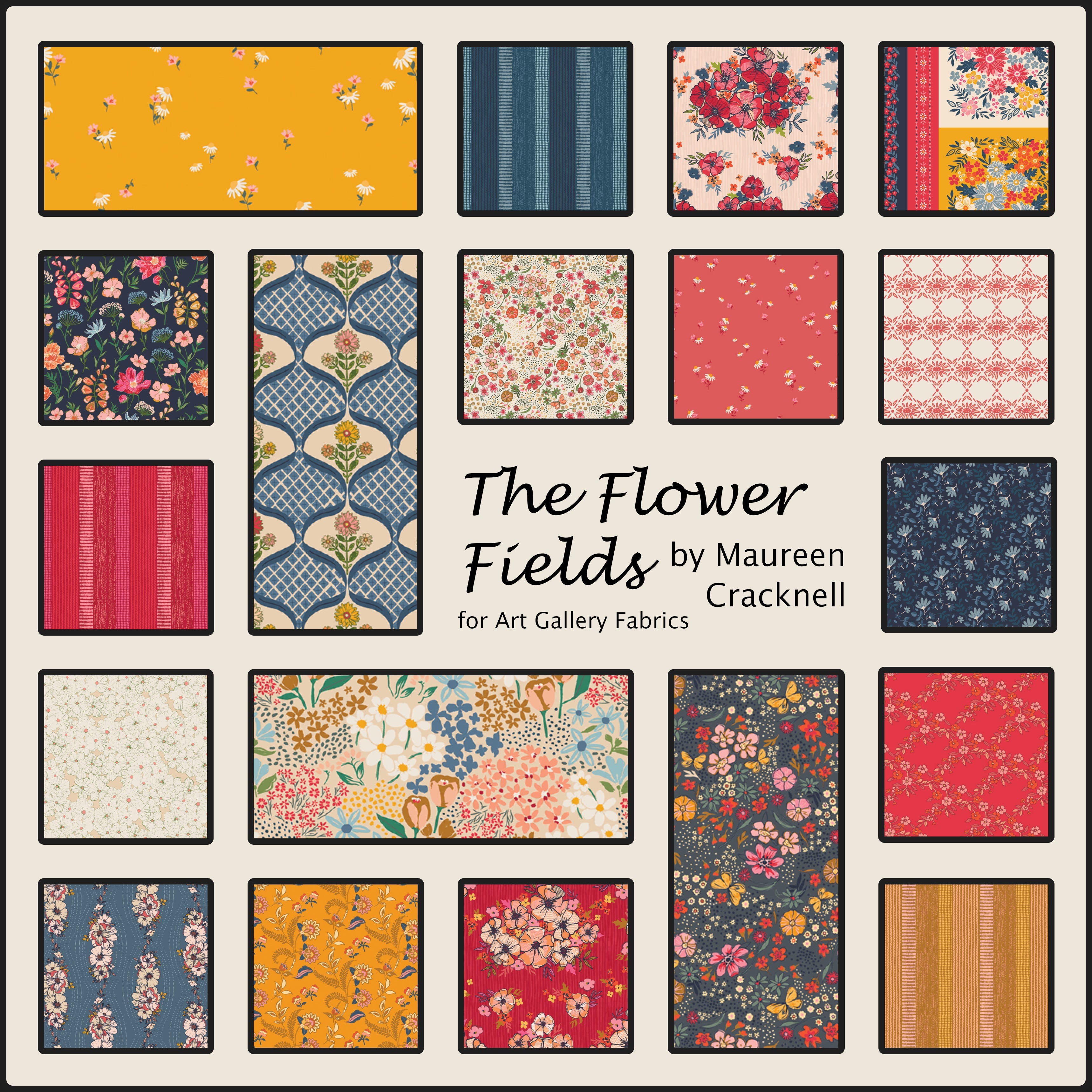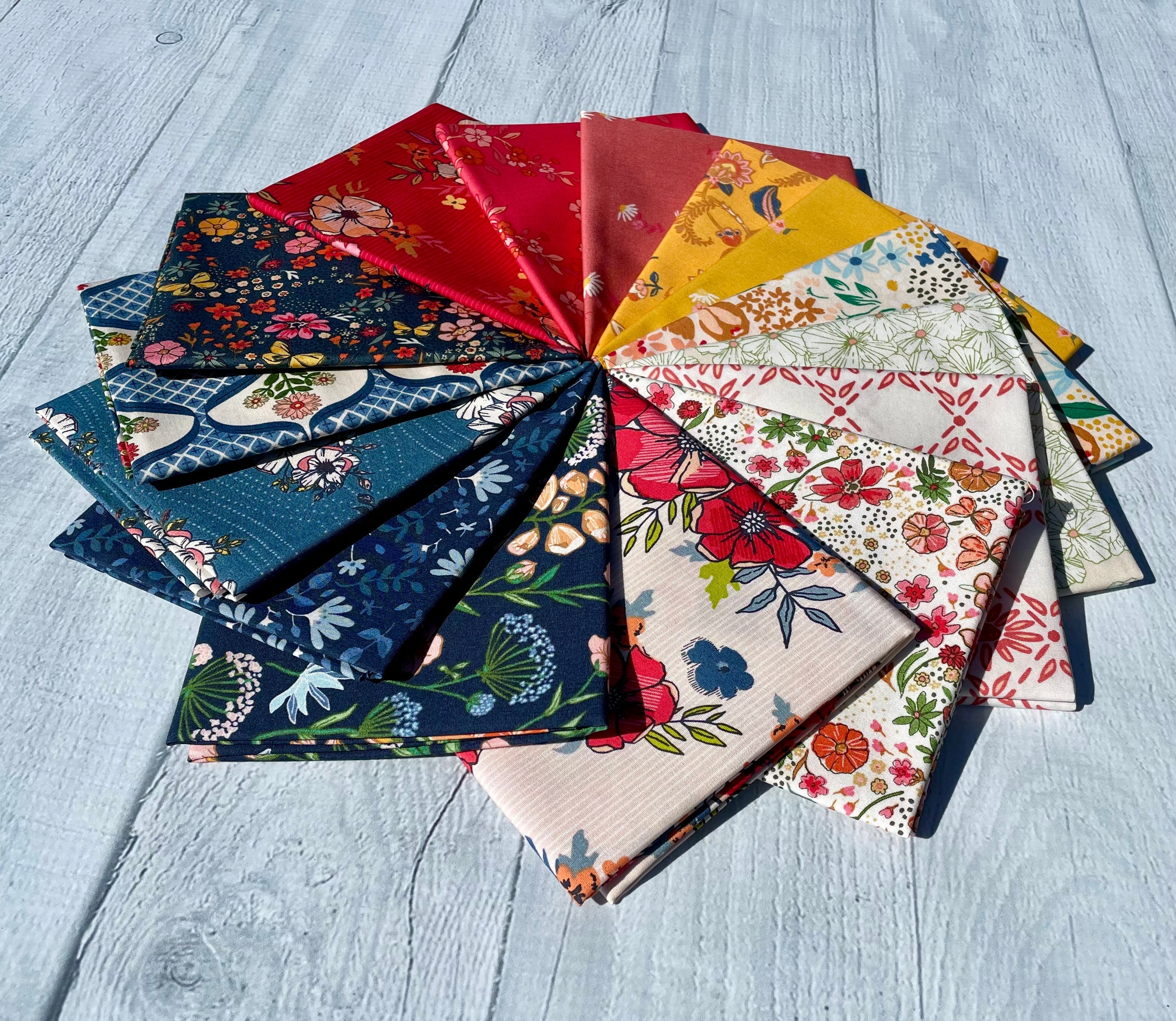 Le lot Flower Fields Half Yard comprend 19 coupes d'un demi-mètre (18" x 42"), une de chaque impression de la collection Flower Fields et trois tissus compagnons de la collection Flower Seeds conçue par Maureen Cracknell pour Art Gallery Fabrics.