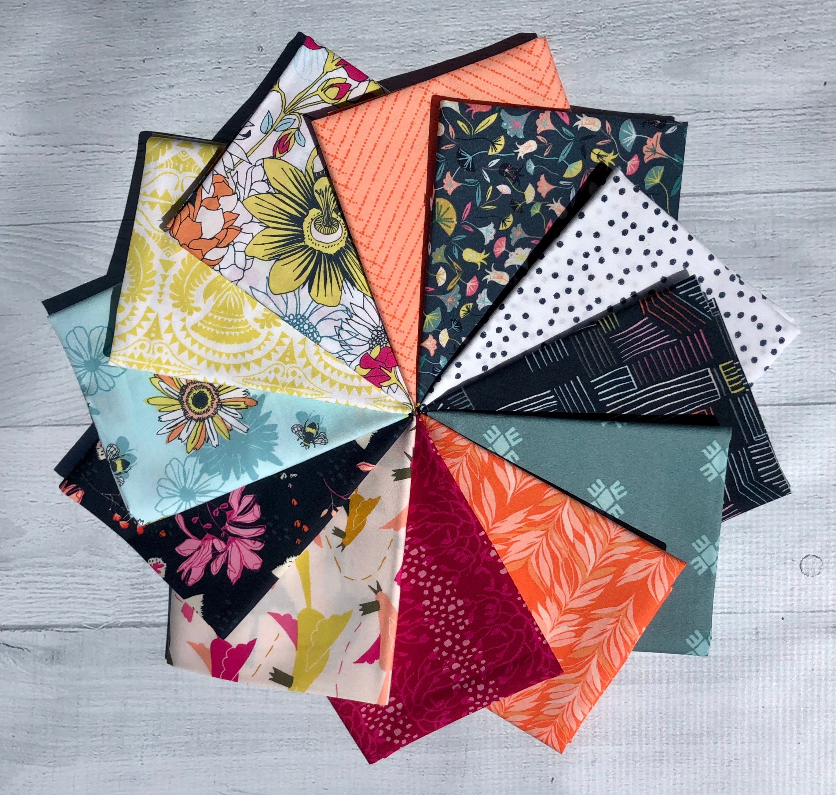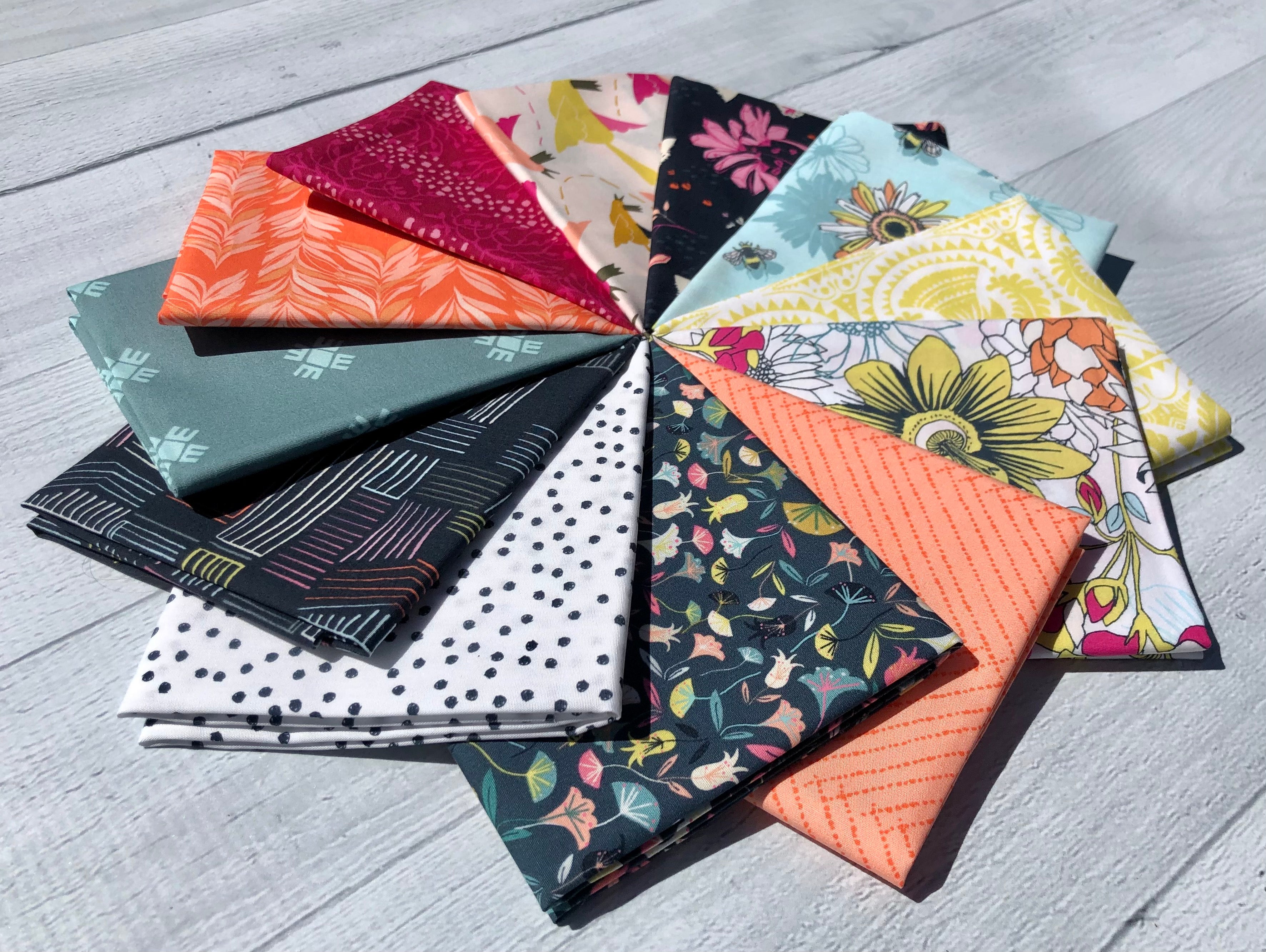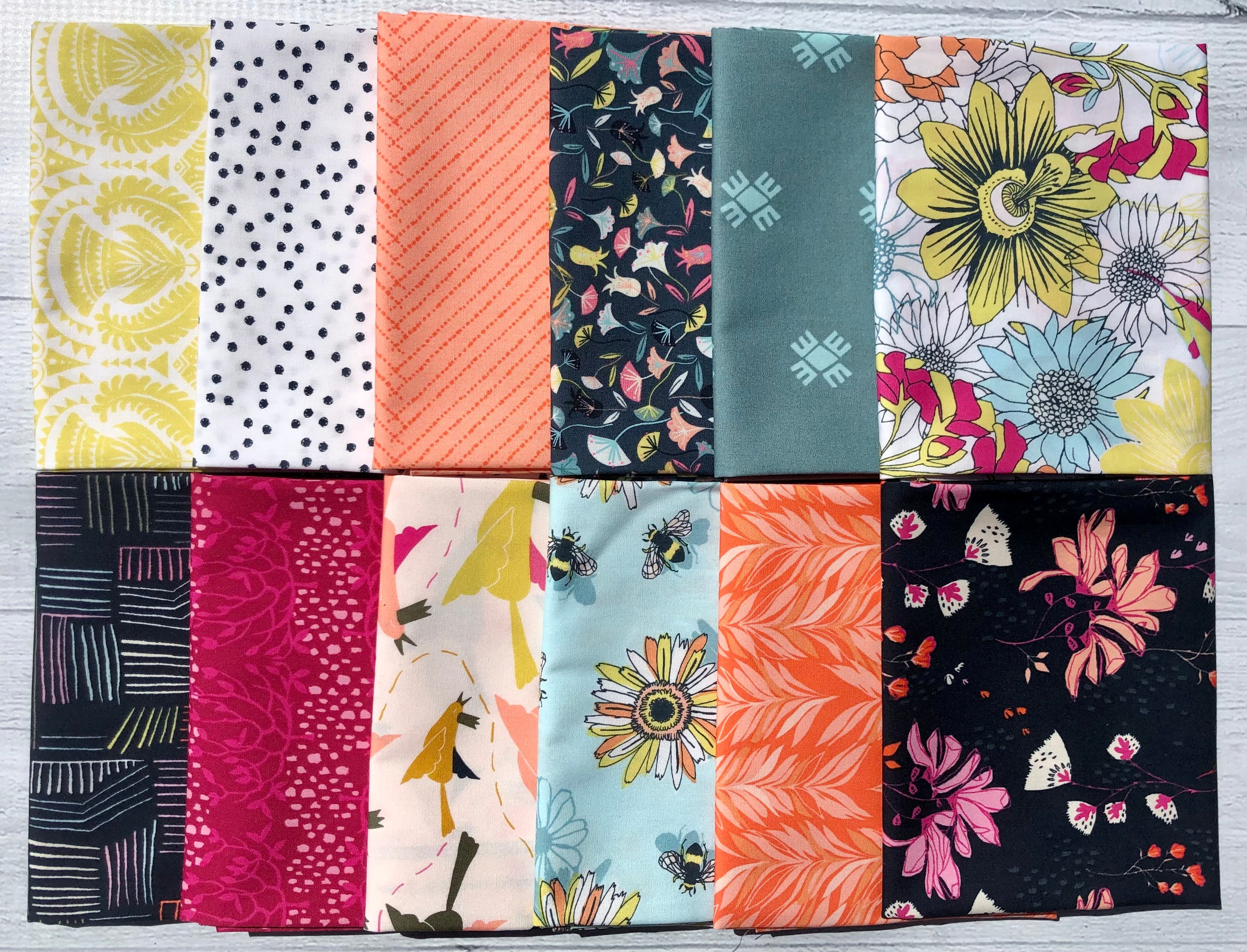 Le lot Pollinate Half Yard comprend 12 coupes d'un demi-mètre (18" x 42"), une de chaque impression de la collection Pollinate conçue par Jessica Swift pour Art Gallery Fabrics.