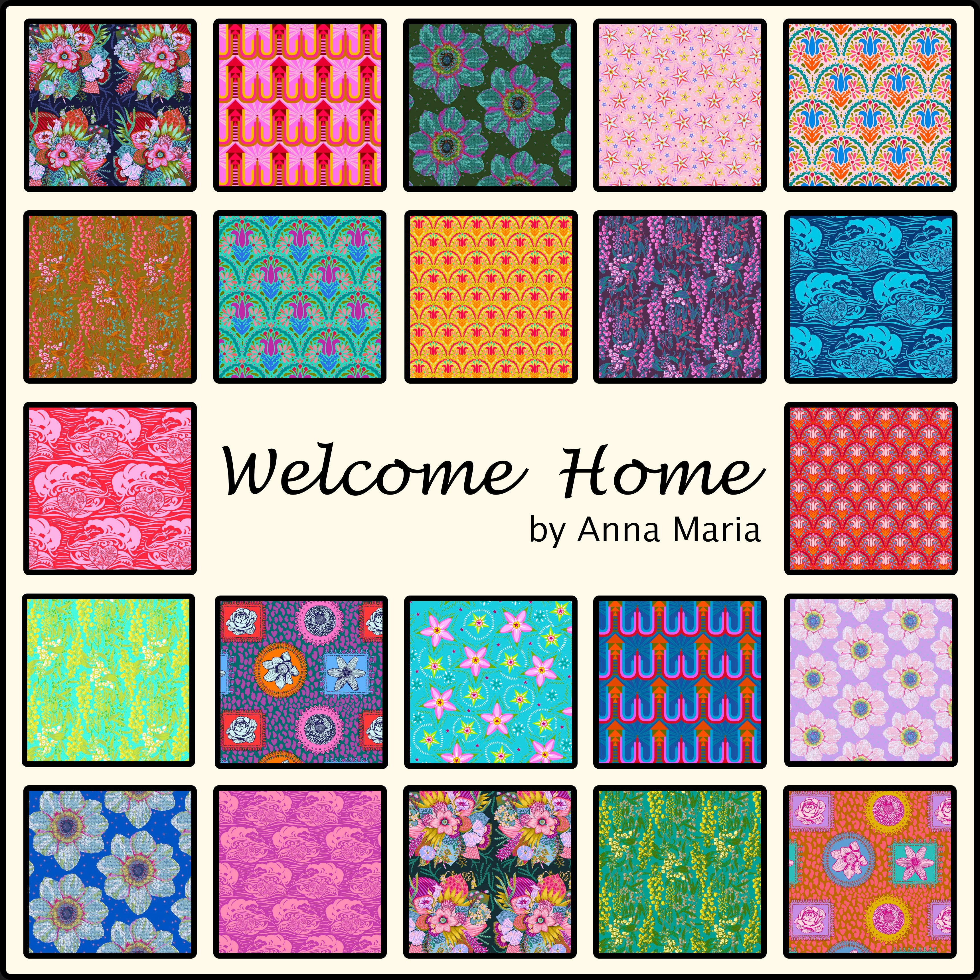 Le lot Welcome Home Fat Quarter comprend 22 gros quartiers (18" x 22"), coupés à la main dans notre boutique. Chaque lot comprend la ligne complète, un exemplaire de chaque imprimé de la collection Welcome Home conçue par Anna Maria.