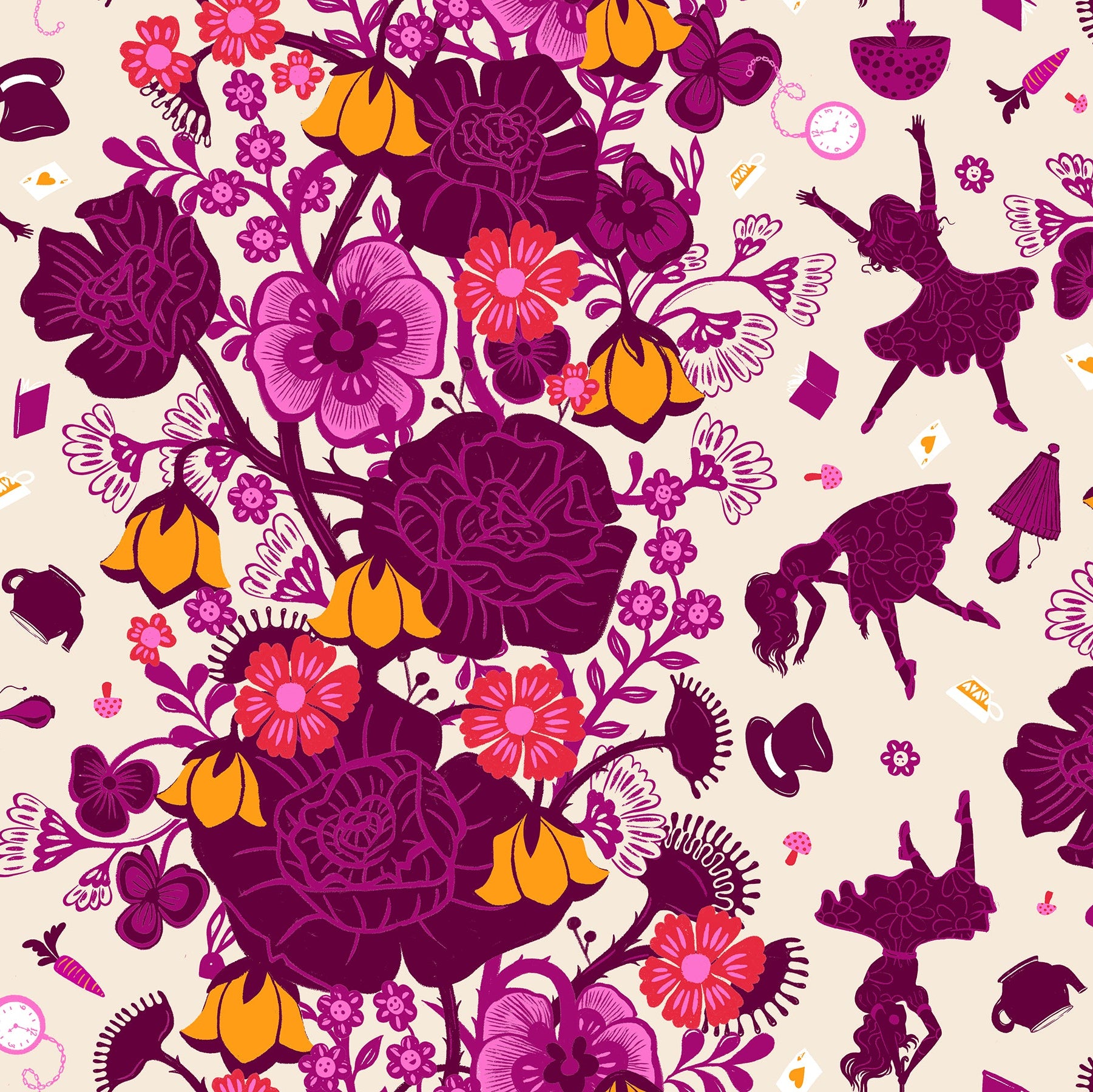 Hello Alice captures the essence of a whimsical tea party, brimming with stacks of books, lively flower fields, and hares racing against time. Sarah Watts infuses the classic tale with her unique narrative style, offering subtle surprises throughout. The collection showcases a vibrant, contemporary color palette that complements the Ruby Star Society line perfectly. This fresh interpretation beautifully balances tradition with modern design.