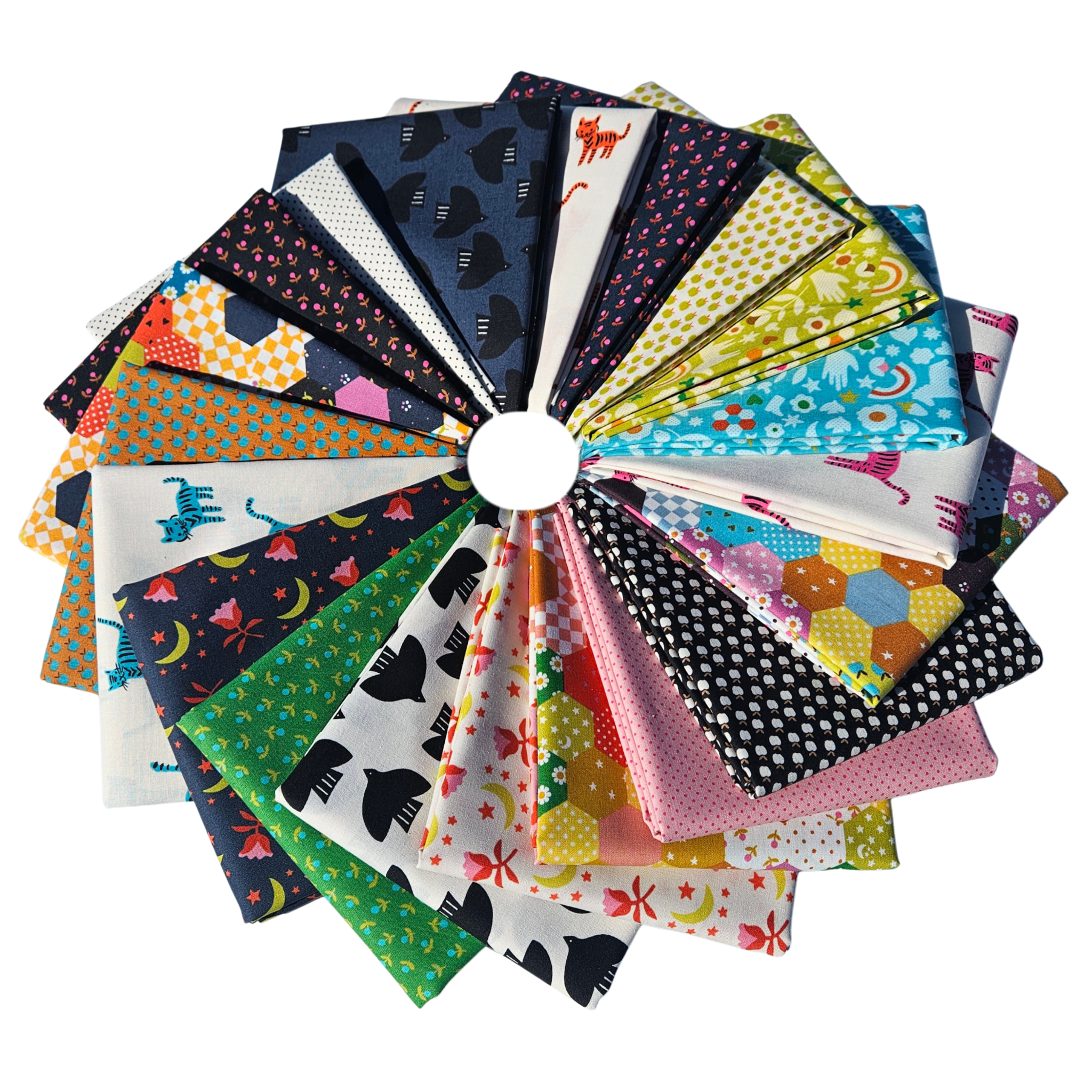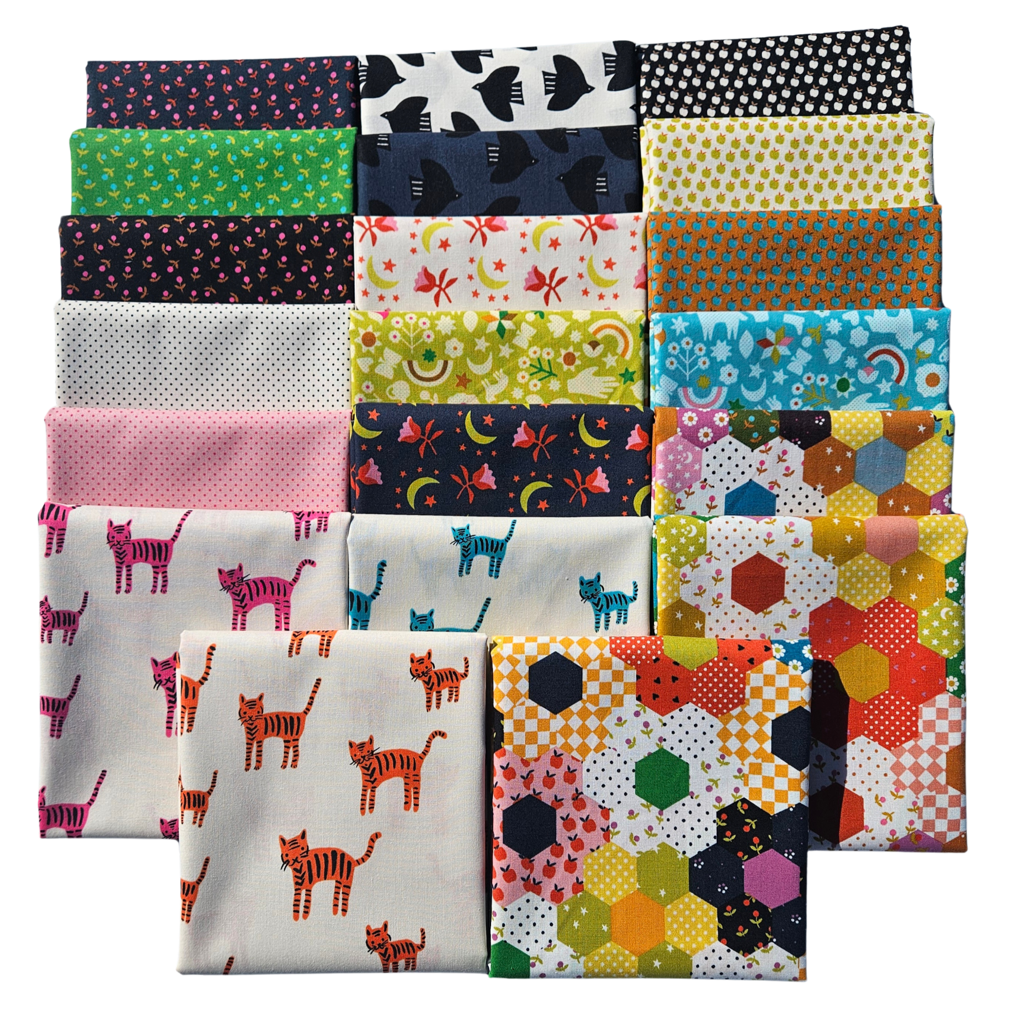 The Catnap 20pc Fat Quarter bundles, (18" x 21"); are hand cut in our shop. Each bundle includes 20 Fat Quarters, one of each print shown in the Catnap collection designed by Alexia Marcelle Abegg of Ruby Star Society.