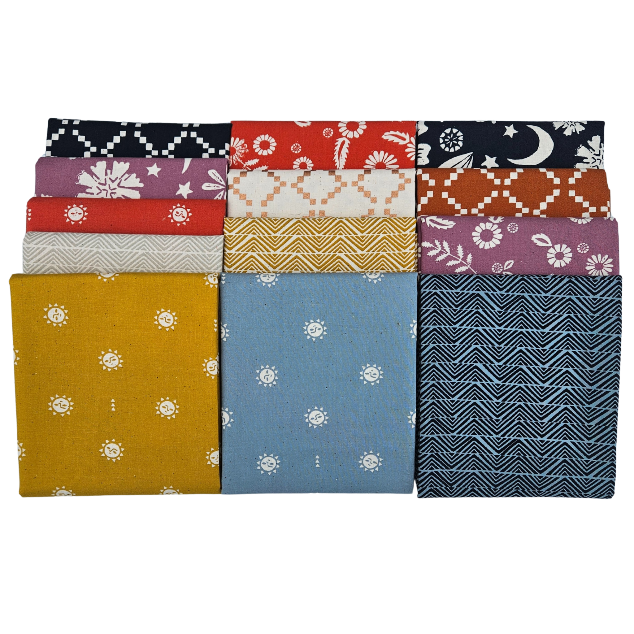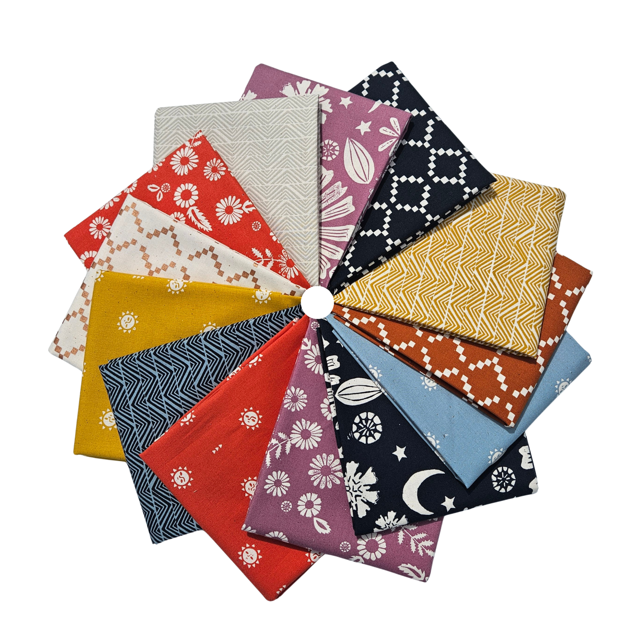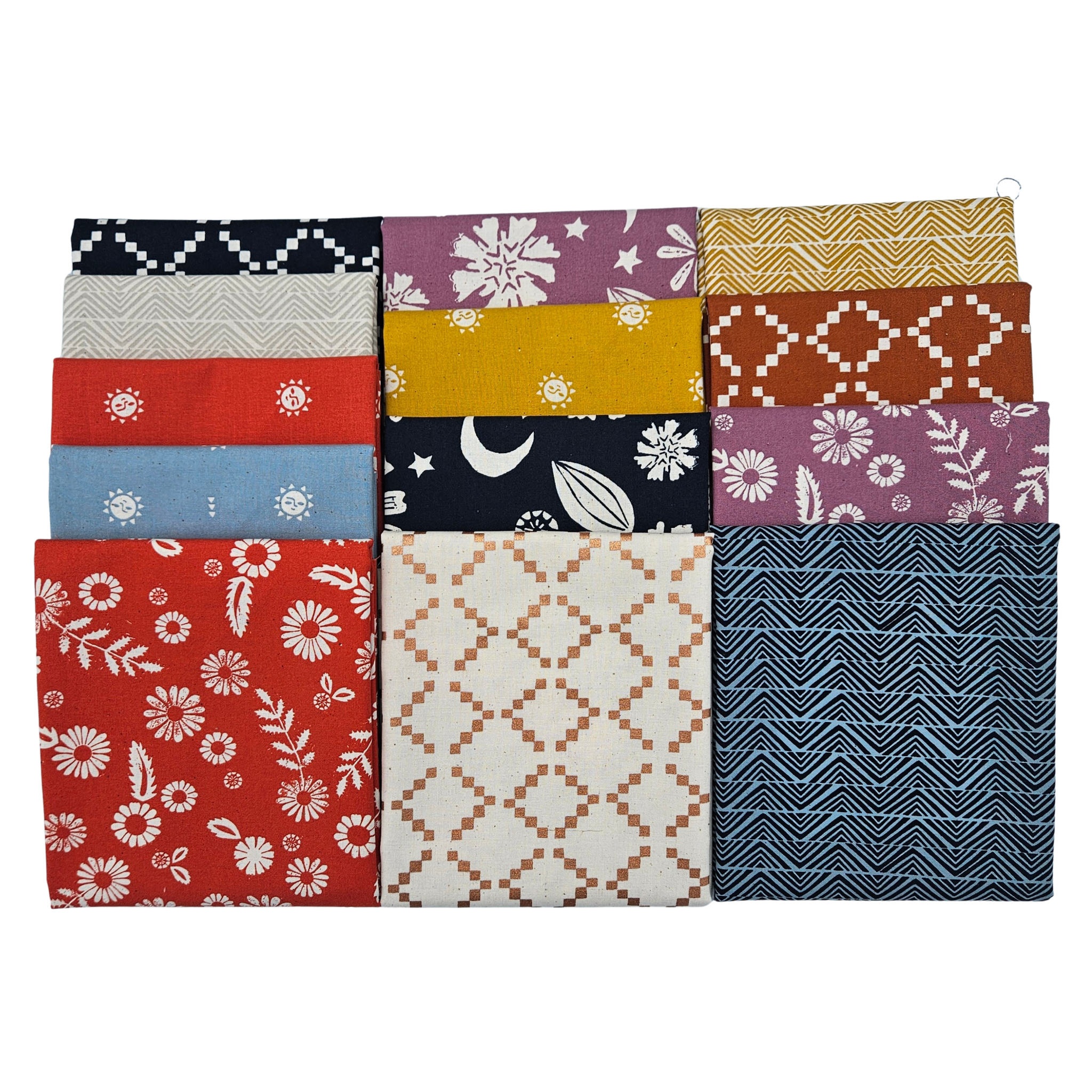 The Golden Hour Fat Quarter bundle includes 13 fat quarters, (18" x 21"), hand cut in our shop. The bundles have one of each print shown from the Golden Hour collection designed by Alexia Marcelle Abegg of Ruby Star Society for Moda Fabrics.