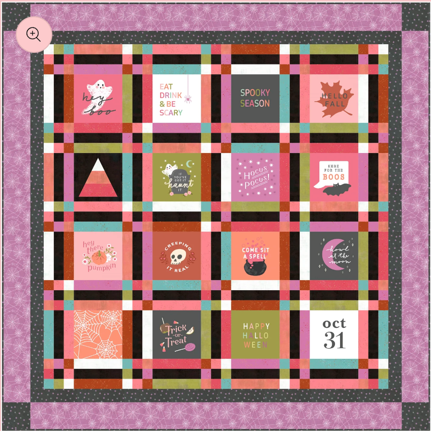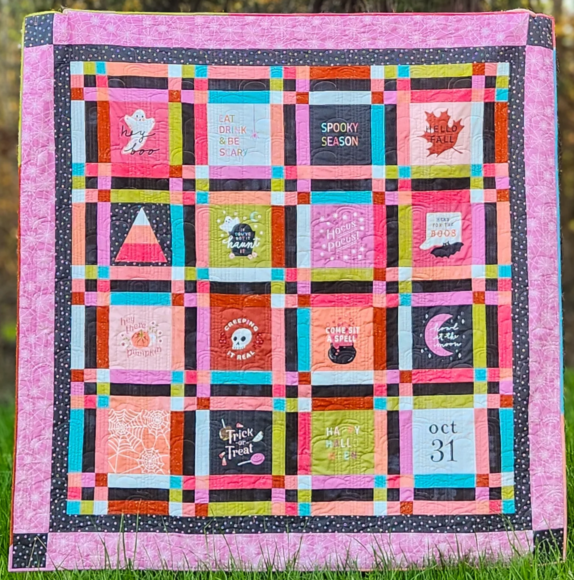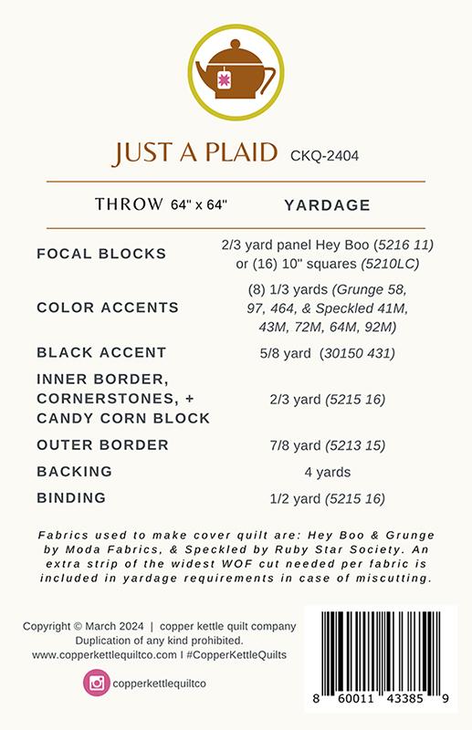 Just a Plaid Paper Quilt Pattern by Sarah Sumbera of Copper Kettle Quilts. This is a fun easy pattern to use for fussy cutting or cutting up a Panel for Halloween or any holiday. Hey Boo Panel available for sale separately. Quilt sample and 📷 photos by Sarah Sumbera.